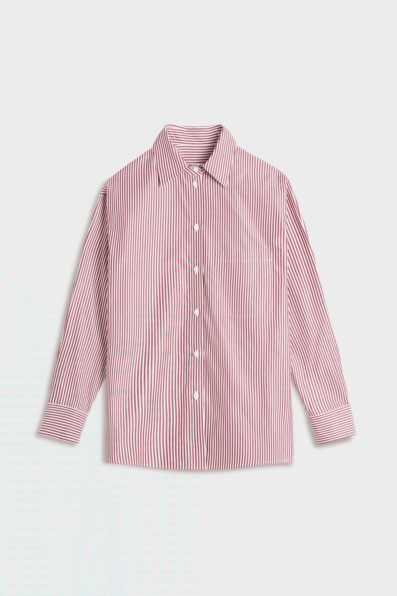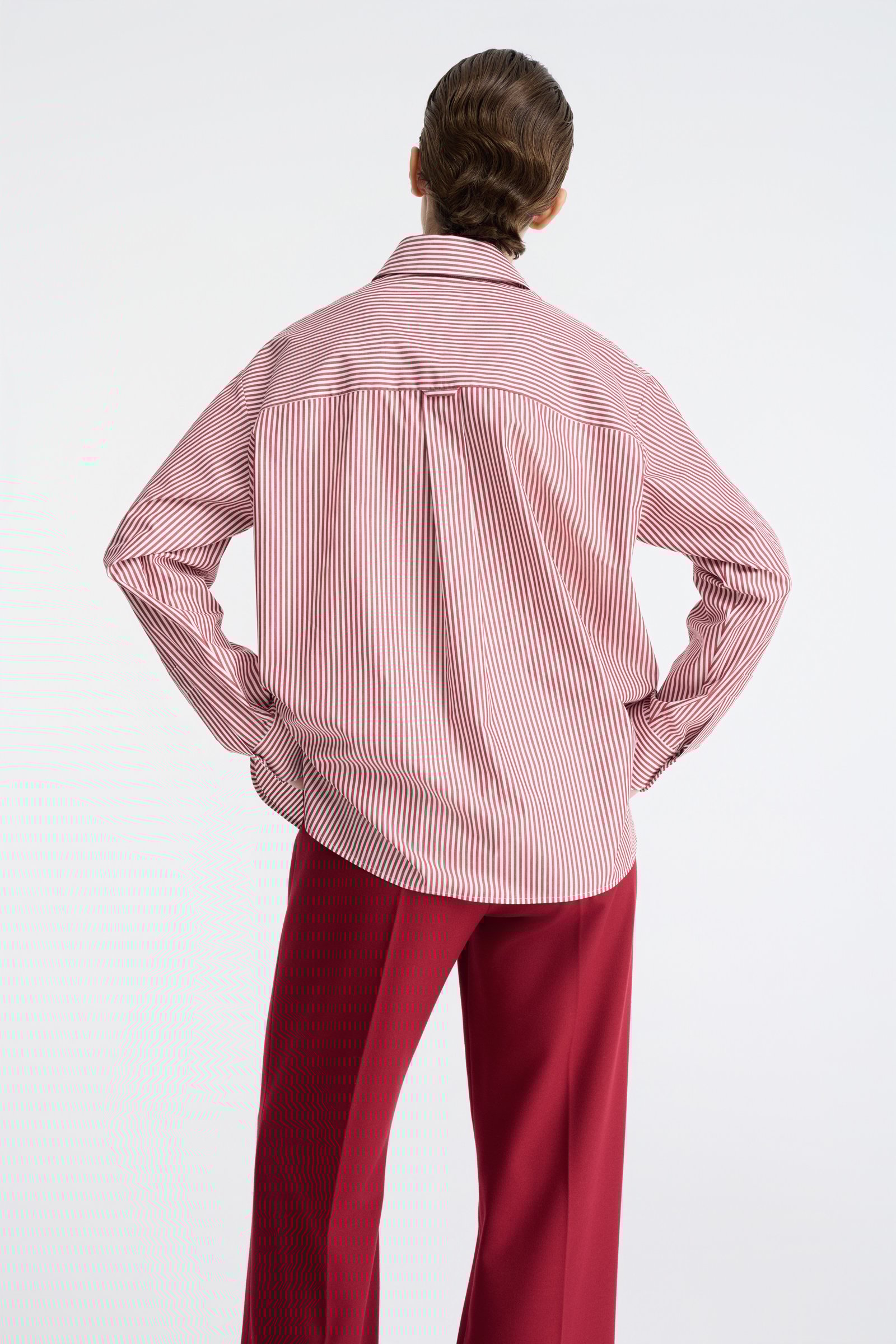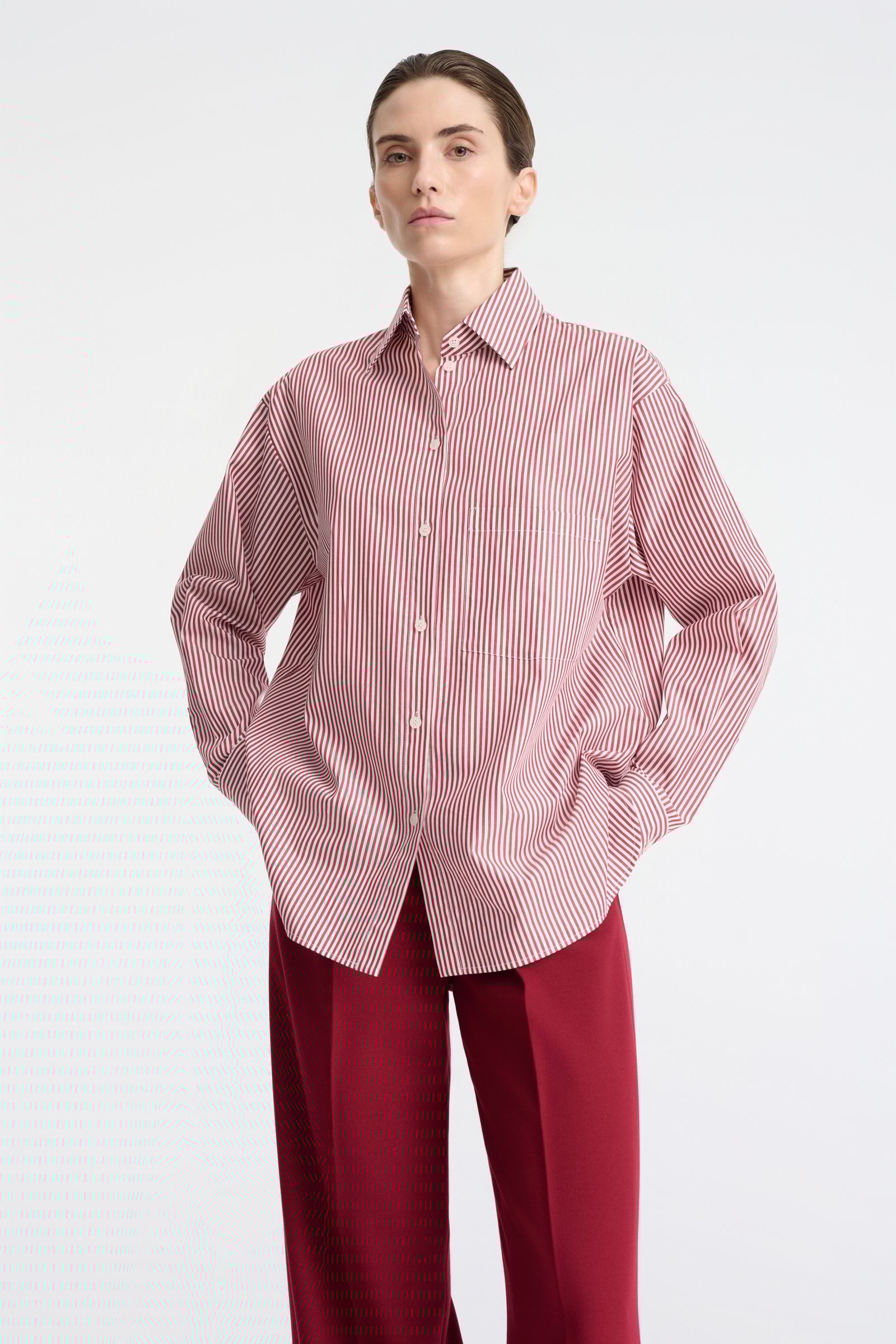 Koszula z bawełnianej popeliny z klasycznym kołnierzykiem i zapięciem na guziki. Zwraca uwagę wyrazistymi prążkami w czerwonym kolorze. To model o swobodnym kroju, który wpisze się zarówno w casualowe, jak i biznesowe stylizacje. Koszula posiada długie rękawy z mankietami, nakładaną kieszeń na klatce piersiowej, boczne rozcięcia, kontrfałdę oraz karczek. Może być noszona luźno, lekko rozpięta i z podwiniętymi rękawami, dzięki czemu zyskuje niezobowiązujący charakter. Alternatywą jest wykorzystywanie jej w nieco bardziej formalnych stylizacjach – z garniturowymi spodniami, marynarką i krawatem.