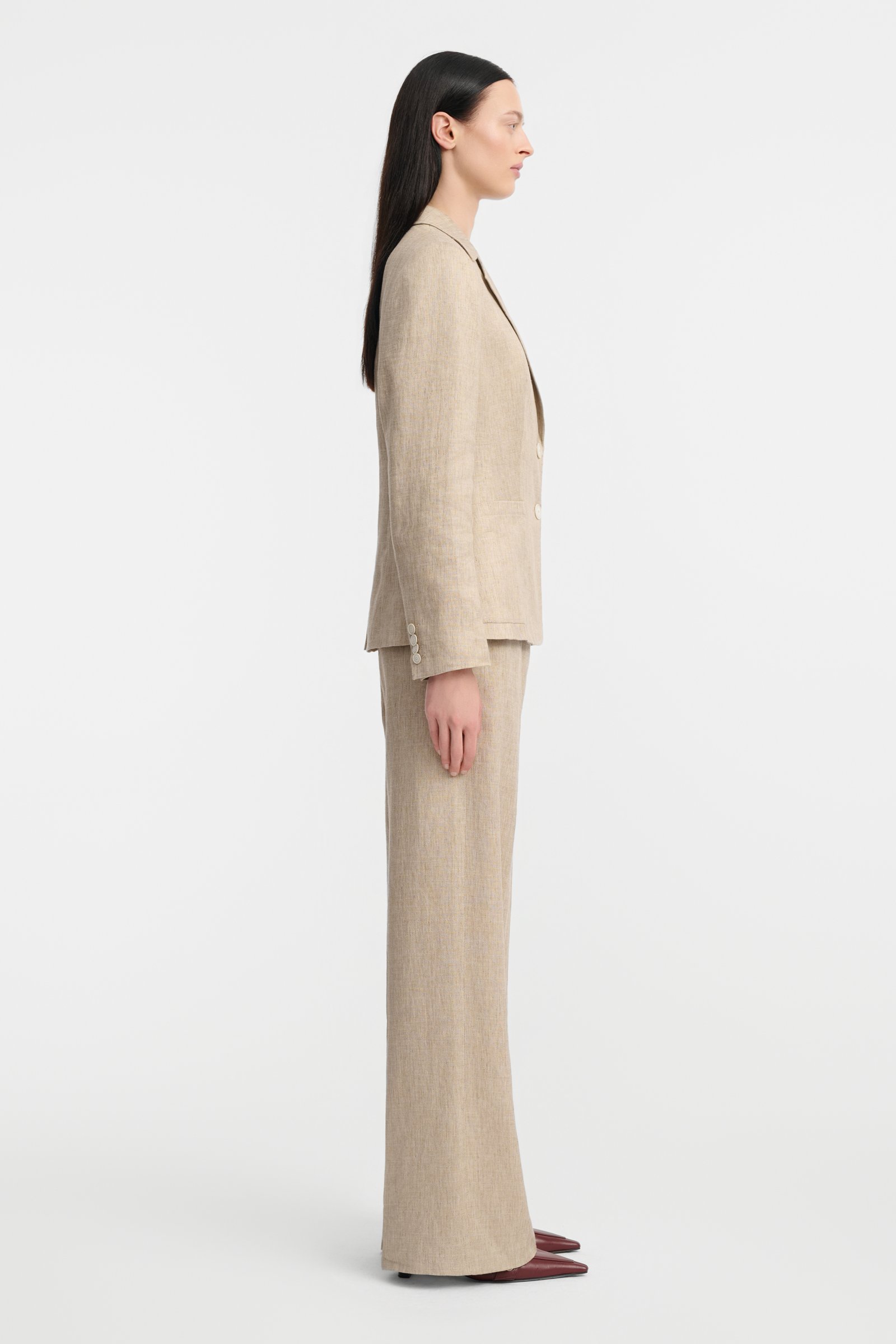 Taliowany żakiet o regularnej długości w stylu safari, uszyty z mieszanki lnu i wiskozy z dodatkiem elastanu. Model beżowy, jednorzędowy, z klasycznym kołnierzykiem, długimi rękawami o zwężanym kroju i nakładanymi kieszeniami. Subtelne stebnowania i dekoracyjne guziki podkreślają casualowy, a zarazem elegancki charakter.