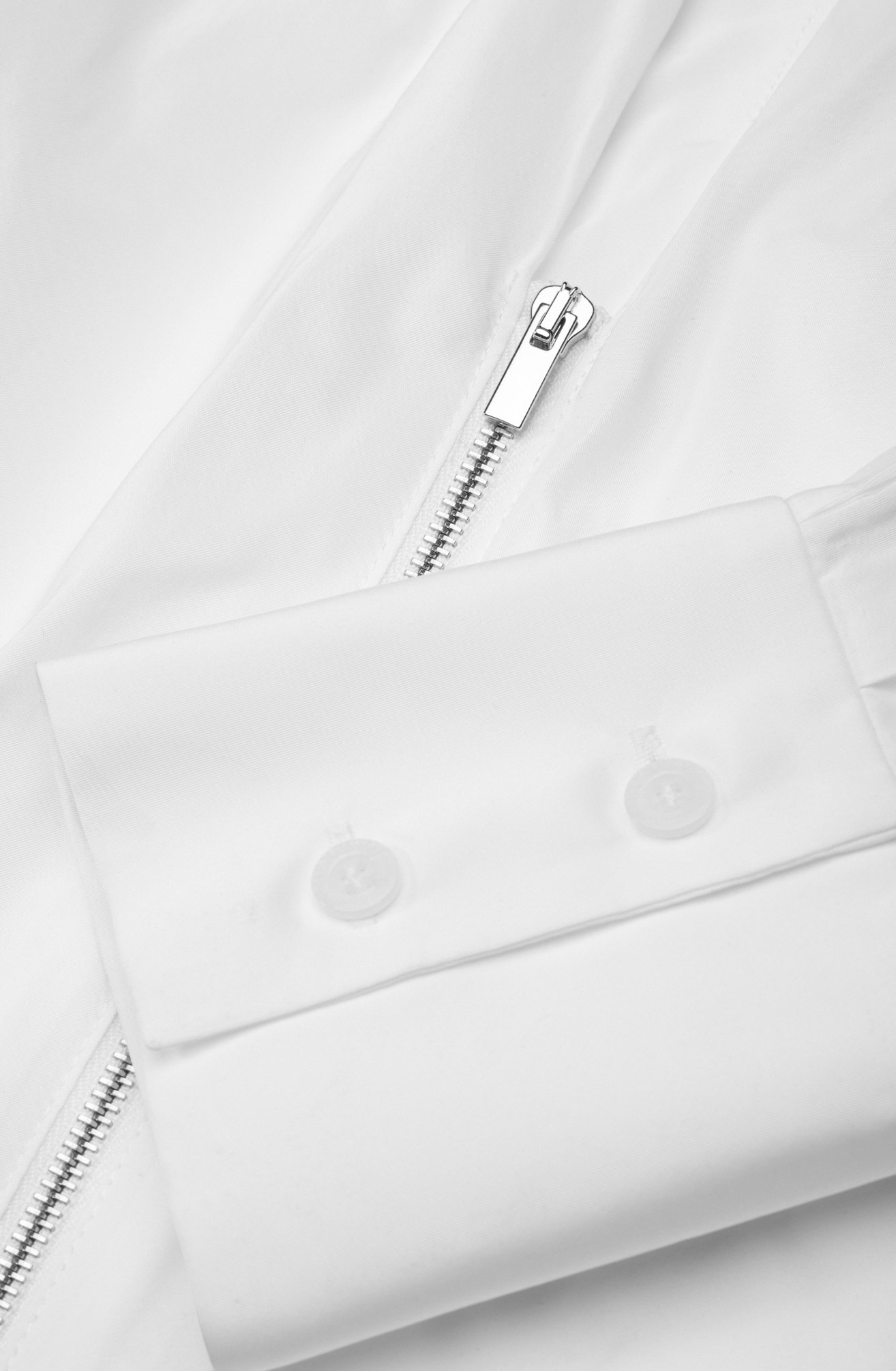 Biała bluzka wykonana z gładkiej tafty. Regularny krój z dekoltem w kształcie litery V. Centralnym elementem ozdobnym jest zamek biegnący przez środek bluzki, który dodaje nowoczesnego charakteru. Subtelne marszczenia przy dekolcie podkreślają elegancki styl i wprowadzają delikatny akcent dekoracyjny. Uniwersalna biel sprawia, że bluzka doskonale komponuje się zarówno ze spodniami o szerokiej nogawce, jak i elegancką spódnicą.