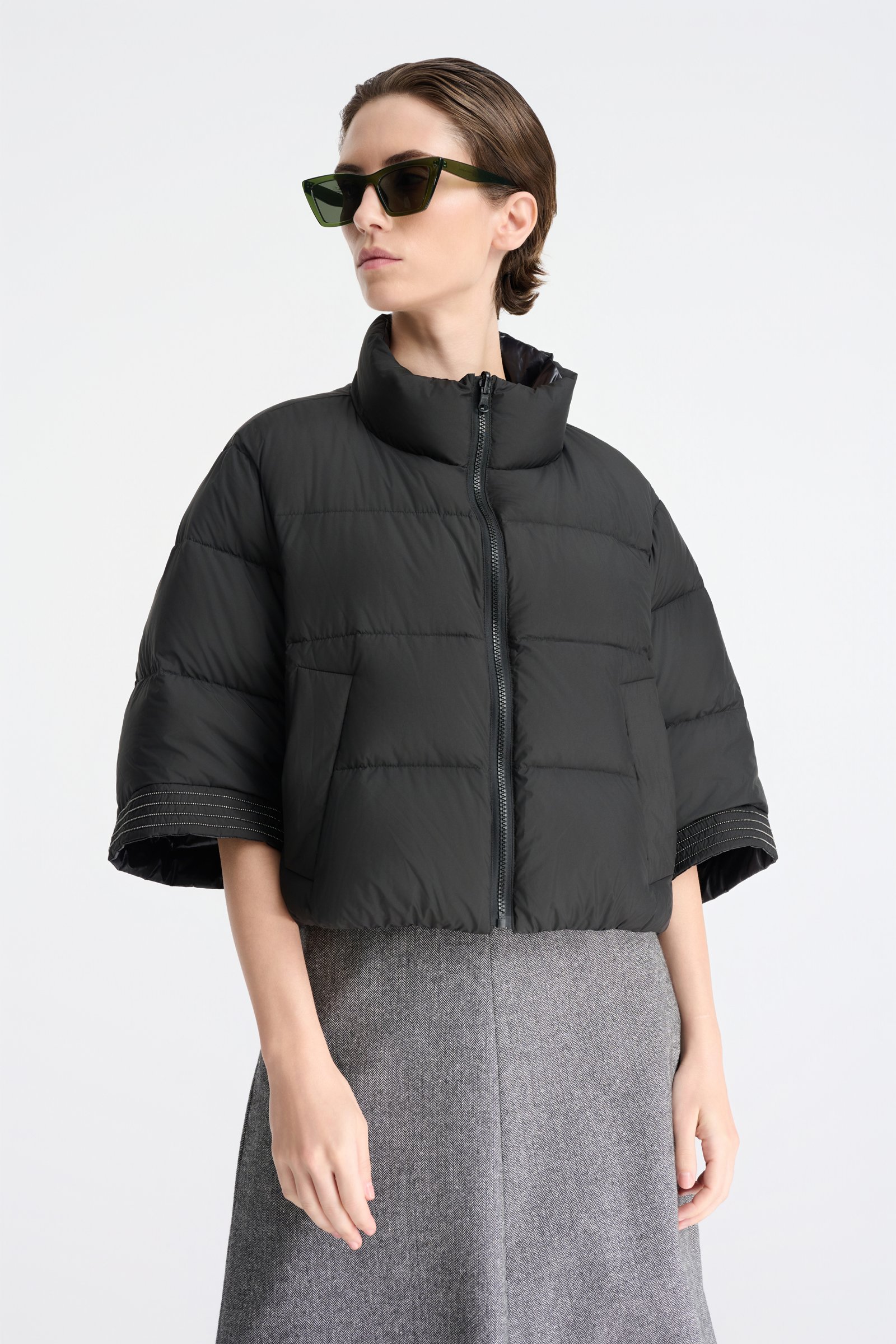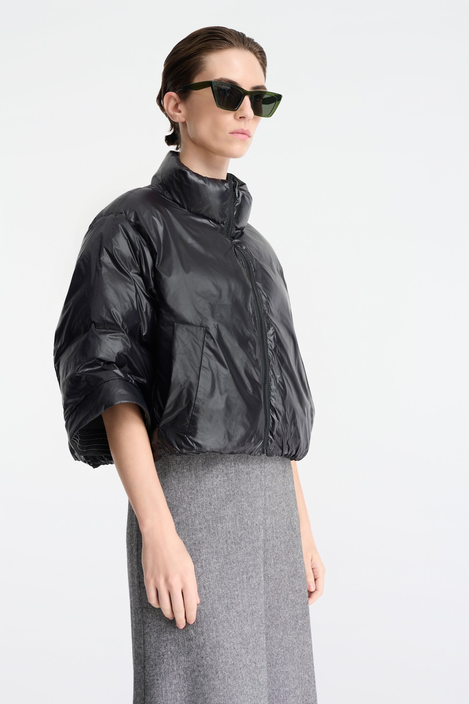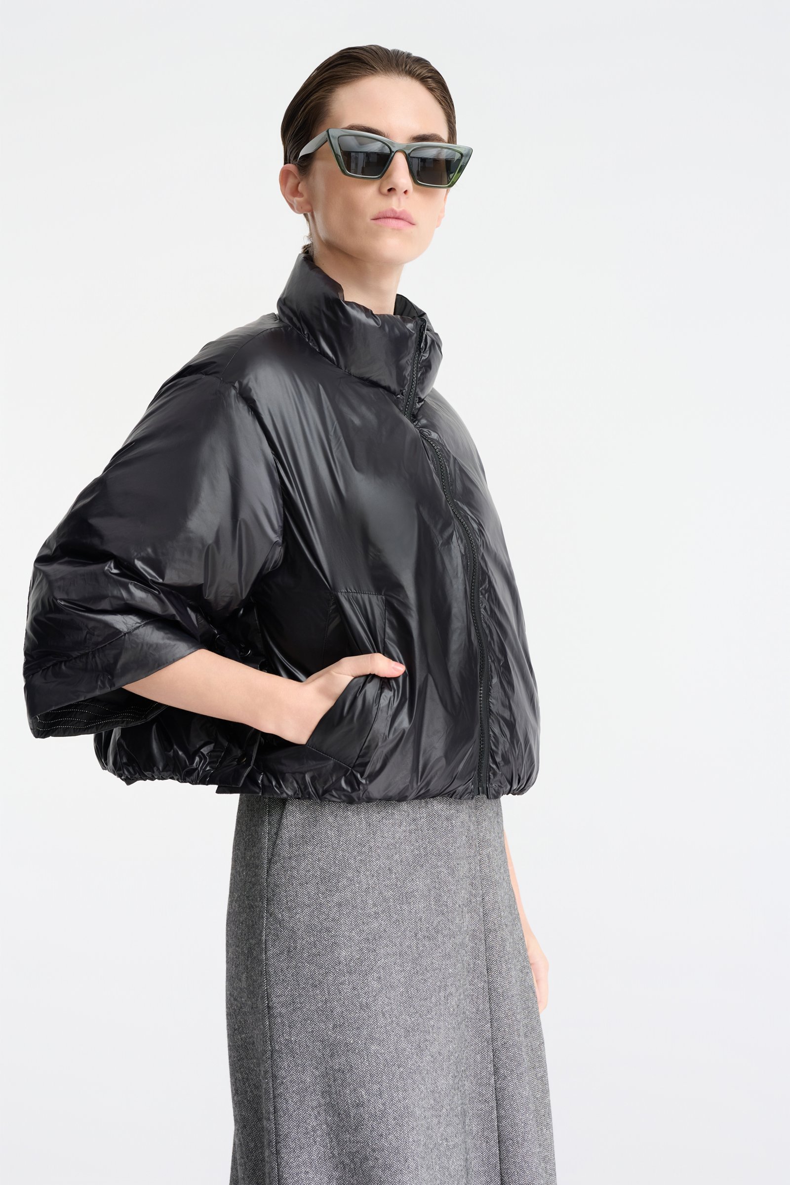 Lekka, a jednocześnie przyjemnie otulająca kurtka o krótkim kroju. Zwraca uwagę szerokimi rękawami o długości 3/4, które podkreślają jej niezobowiązujący charakter. To dwustronny model w klasycznej czerni, ale o zupełnie innym wykończeniu każdej ze stron. Jedna jest matowa, a krawędź rękawów wieńczy ozdobna taśma. Druga charakteryzuje się delikatnym połyskiem materiału. To kurtka o długości do biodra, ze stójką oraz kieszeniami. Jest zapinana na zamek, obustronnie pikowana. Jej mocnym atutem jest naturalne wypełnienie z gęsiego puchu – to decyduje o jej lekkości, a także o bardzo wysokim komforcie noszenia. Gęsi puch posiada świetne właściwości termoregulujące, jest ciepły, a jednocześnie przewiewny. To kurtka w sam raz do casualowych i weekendowych stylizacji – świetnie pasuje do spodni, ale też do sukienek i dłuższych spódnic.