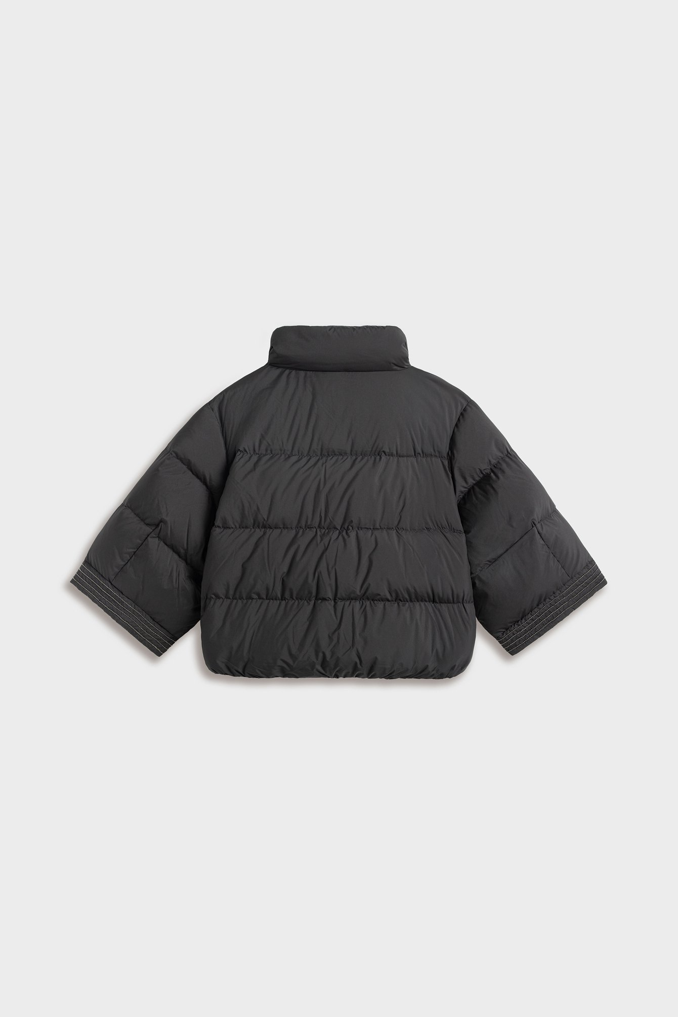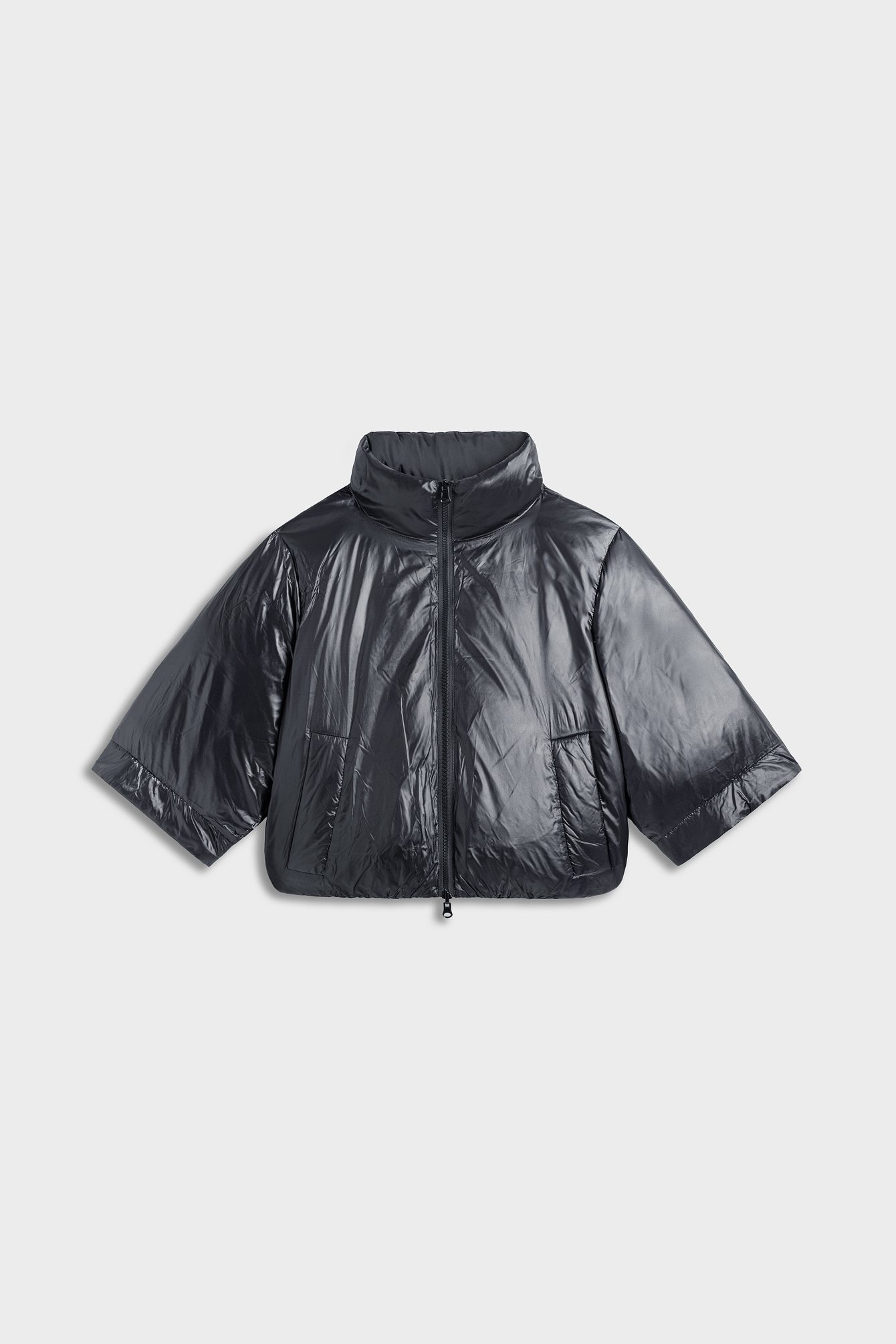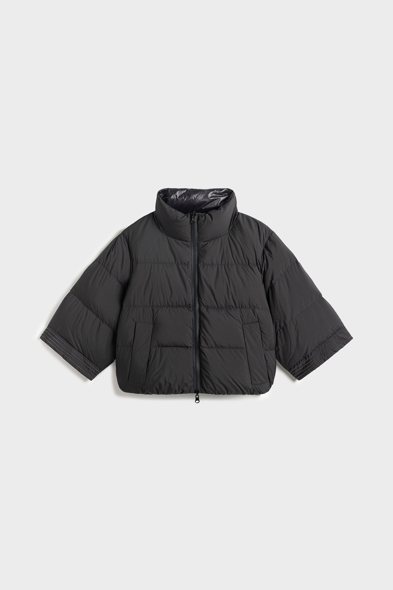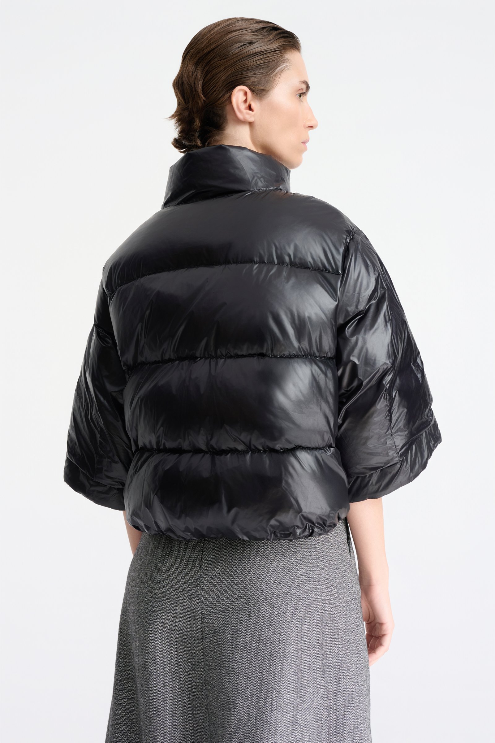 Lekka, a jednocześnie przyjemnie otulająca kurtka o krótkim kroju. Zwraca uwagę szerokimi rękawami o długości 3/4, które podkreślają jej niezobowiązujący charakter. To dwustronny model w klasycznej czerni, ale o zupełnie innym wykończeniu każdej ze stron. Jedna jest matowa, a krawędź rękawów wieńczy ozdobna taśma. Druga charakteryzuje się delikatnym połyskiem materiału. To kurtka o długości do biodra, ze stójką oraz kieszeniami. Jest zapinana na zamek, obustronnie pikowana. Jej mocnym atutem jest naturalne wypełnienie z gęsiego puchu – to decyduje o jej lekkości, a także o bardzo wysokim komforcie noszenia. Gęsi puch posiada świetne właściwości termoregulujące, jest ciepły, a jednocześnie przewiewny. To kurtka w sam raz do casualowych i weekendowych stylizacji – świetnie pasuje do spodni, ale też do sukienek i dłuższych spódnic.