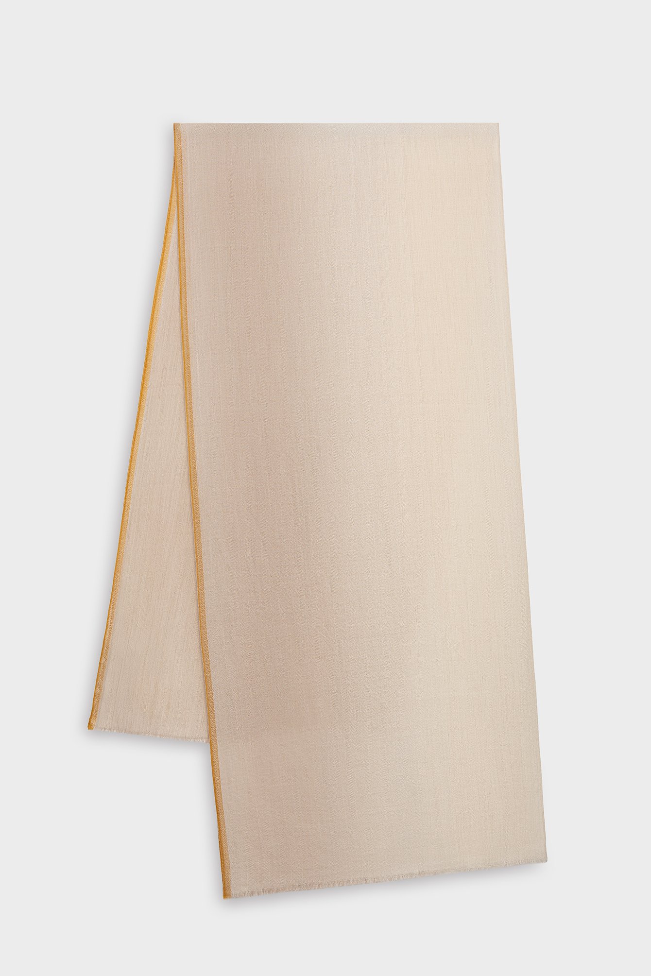 Szal wykonany z wyjątkowo cienkiej i miękkiej przędzy, otula skórę niczym jedwab, zapewniając jednocześnie naturalne ciepło i komfort noszenia. Delikatny beżowy odcień z eleganckim wykończeniem w kolorze złota nadaje temu modelowi wyjątkowego charakteru – to idealny dodatek zarówno na co dzień, jak i na bardziej formalne okazje. Niezwykle lekki i oddychający, świetnie sprawdzi się przez cały rok – od wiosennych poranków po jesienne i zimowe chłody. To szal, który zachwyca detalem i jakością. Luksusowy w dotyku, elegancki w wyglądzie – stanie się ulubionym dodatkiem na lata.