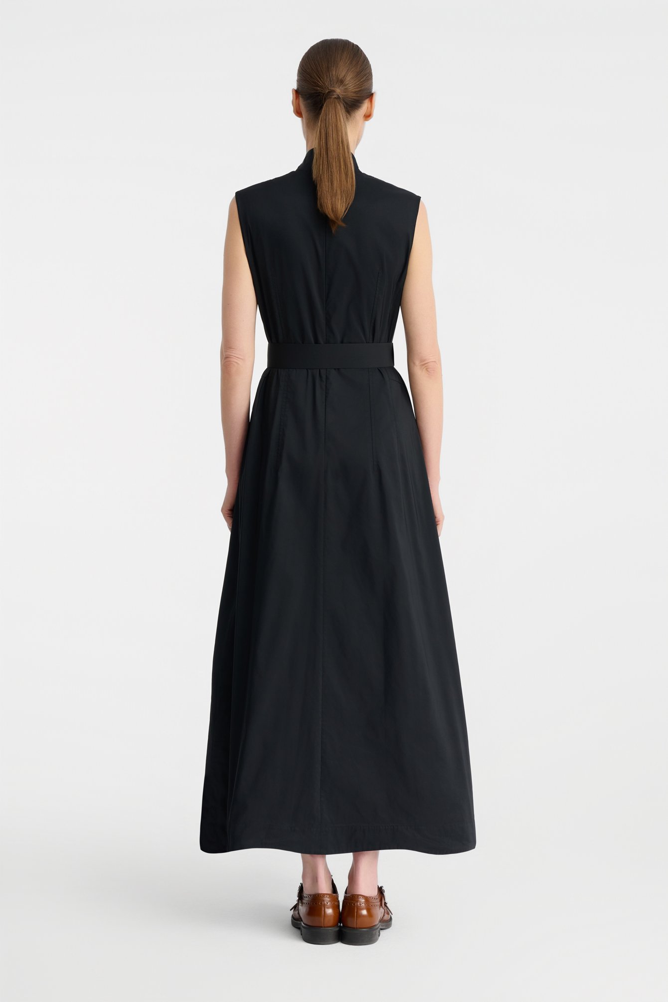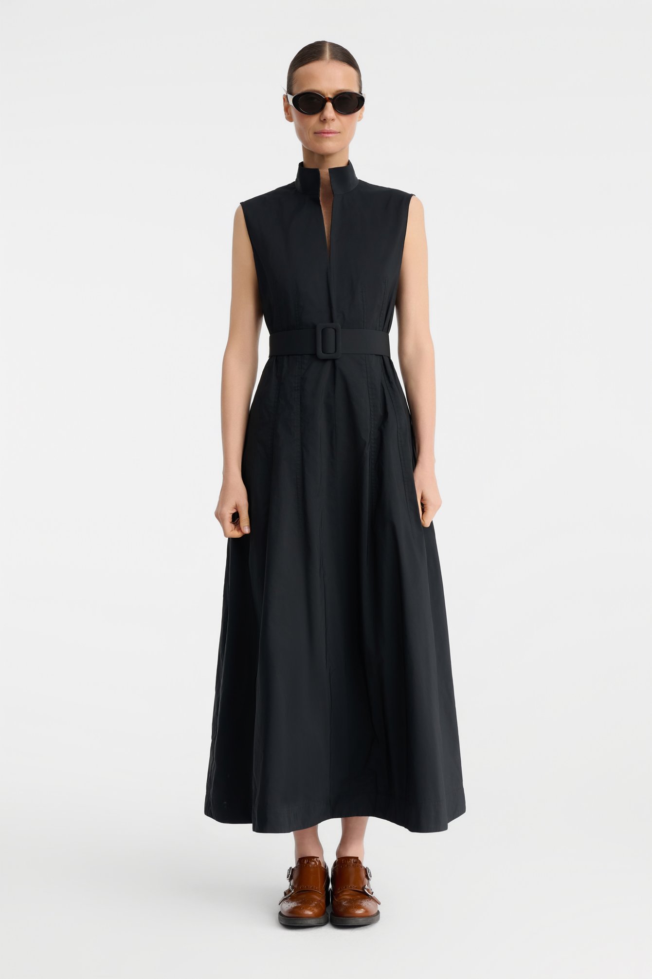 Długa, rozkloszowana sukienka zachowana w klasycznej czerni. Wykonana z wysokiej jakości tafty o gładkiej strukturze, zachwyca subtelnym połyskiem i perfekcyjnym krojem, który podkreśla sylwetkę. Cechuje ją wyrafinowana prostota – idealna na wyjątkowe okazje, spotkania biznesowe lub eleganckie przyjęcia. Wysoka stójka z delikatnym pęknięciem dekoltu dodaje całości szyku i nuty awangardy, a dopasowany w talii pas oblekany tkaniną harmonijnie modeluje figurę. Zamek ukryty w szwie zapewnia wygodę noszenia i estetyczne wykończenie, a praktyczne kieszenie w bocznych szwach nadają projektowi nowoczesny charakter.