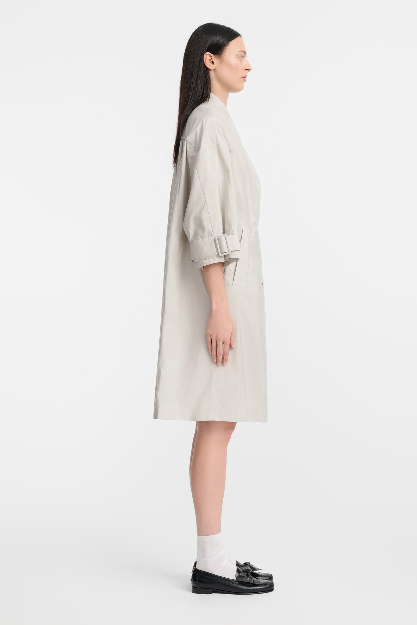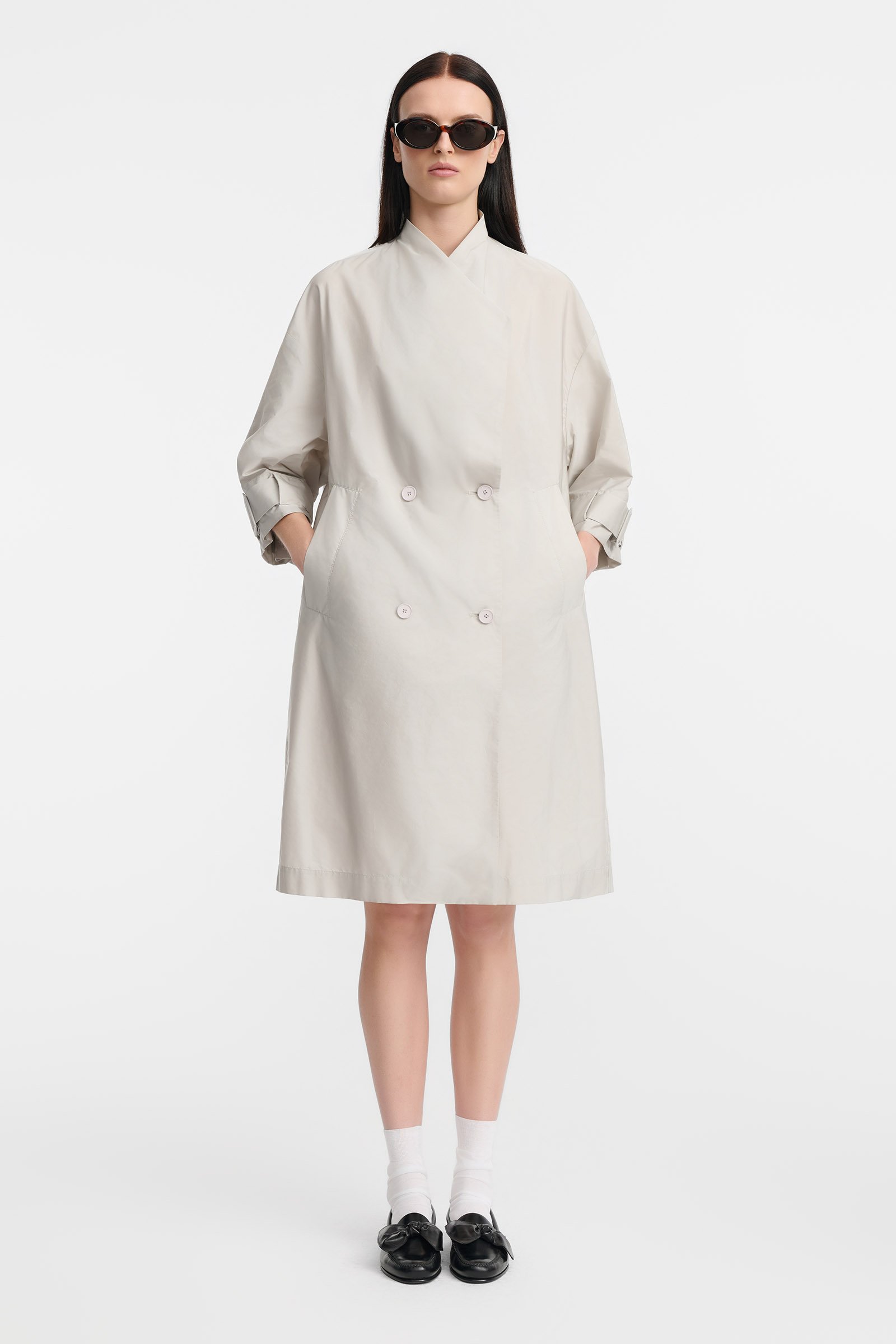 Płaszcz o długości midi i fasonie oversize. Model o uniwersalnym, casualowym charakterze, zaprojektowany z myślą o swobodnej formie i funkcjonalności. Asymetryczny dekolt oraz dwurzędowe zapięcie na guziki nadają całości nowoczesny wygląd. Płaszcz posiada rękawy o prostym kroju i długości 3/4, wykończone paskami przy mankietach. W bocznych szwach umieszczono skośne kieszenie. Gładka powierzchnia tkaniny została uzupełniona o efekt marszczenia, który wprowadza subtelne zróżnicowanie struktury.