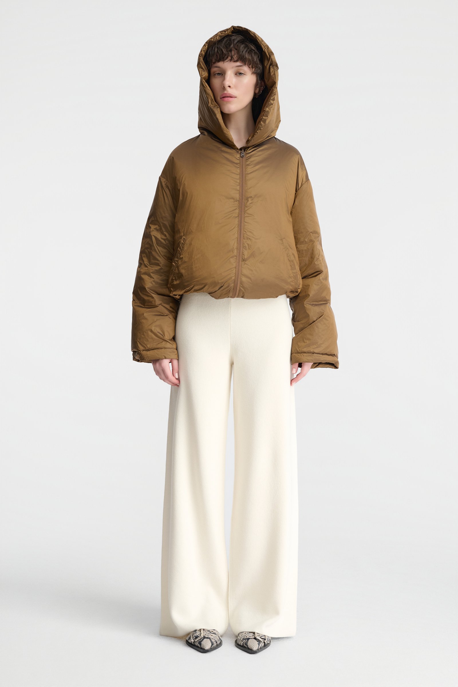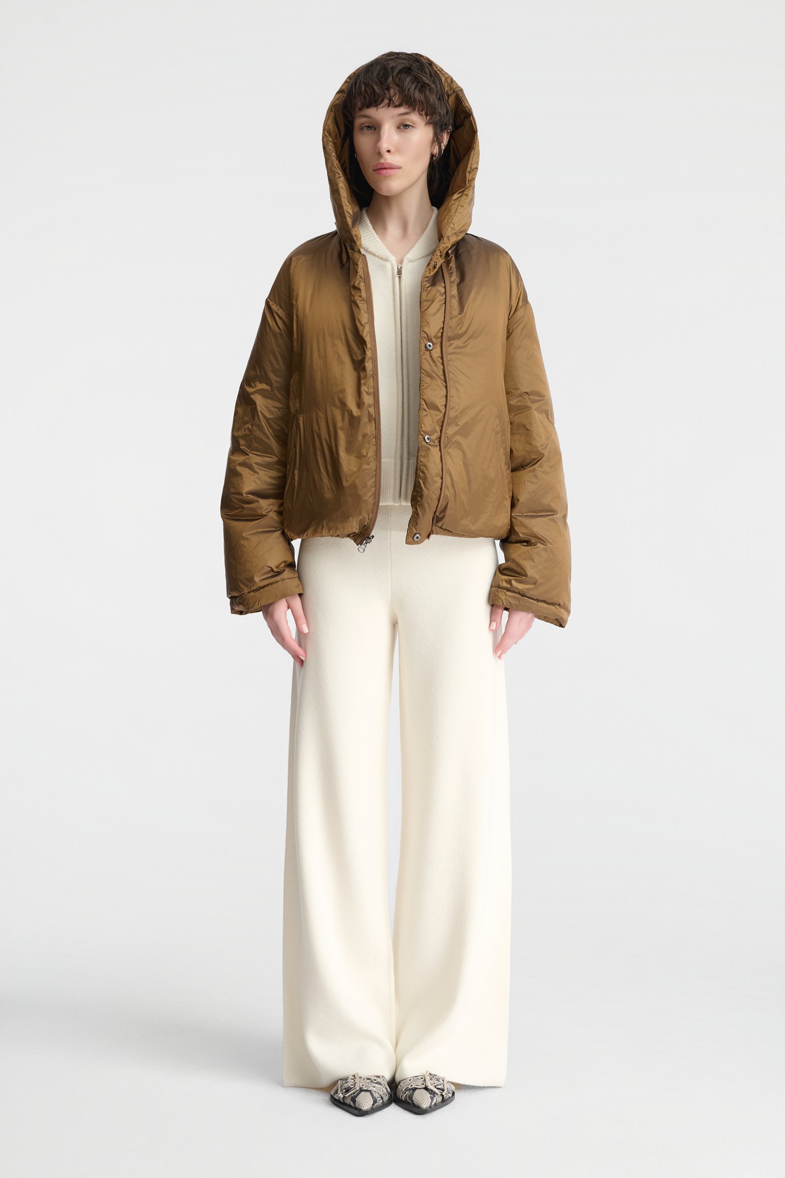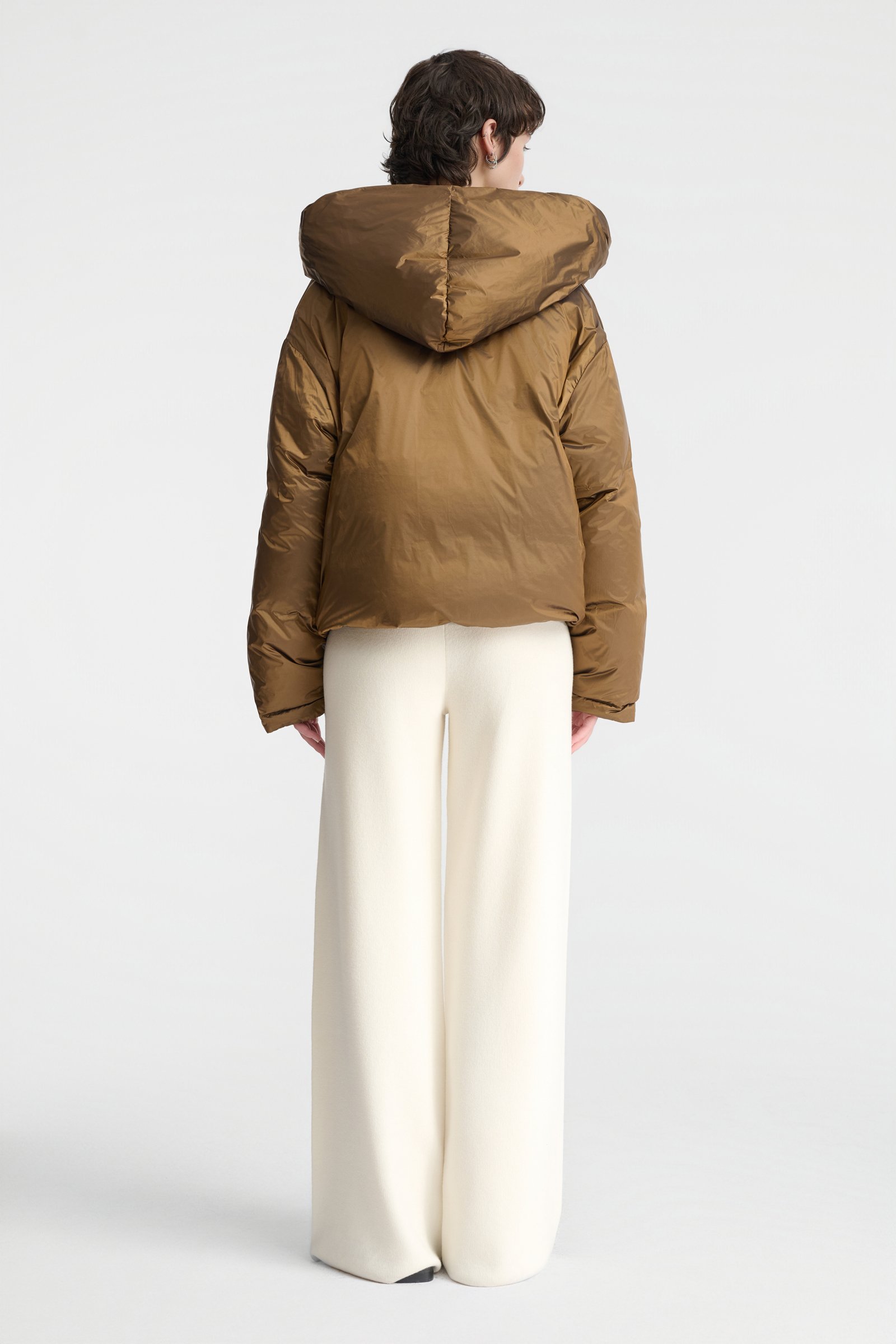 Lekka, a jednocześnie ciepła kurtka o krótkim kroju. Zwraca uwagę niezwykłym odcieniem złocistej oliwki – to piękna barwa, która nada charakter każdej stylizacji. Świetnie skomponuje się zarówno z czernią lub czekoladowym brązem, jak i z odcieniami beżu i écru. To dwustronny model z kapturem i puchowym wypełnieniem. Jedna ze stron jest gładka i minimalistyczna, druga posiada poziome pikowanie w szerokie pasy. Kurtka posiada dyskretne kieszenie, zapięcie na zamek, swobodne rękawy oraz obszerny kaptur. Krótki krój powoduje, że doskonale komponuje się z dołami o podniesionej talii. Będzie efektownym zwieńczeniem stylizacji – można nosić ją w okresie przejściowym oraz w cieplejsze zimowe dni.
