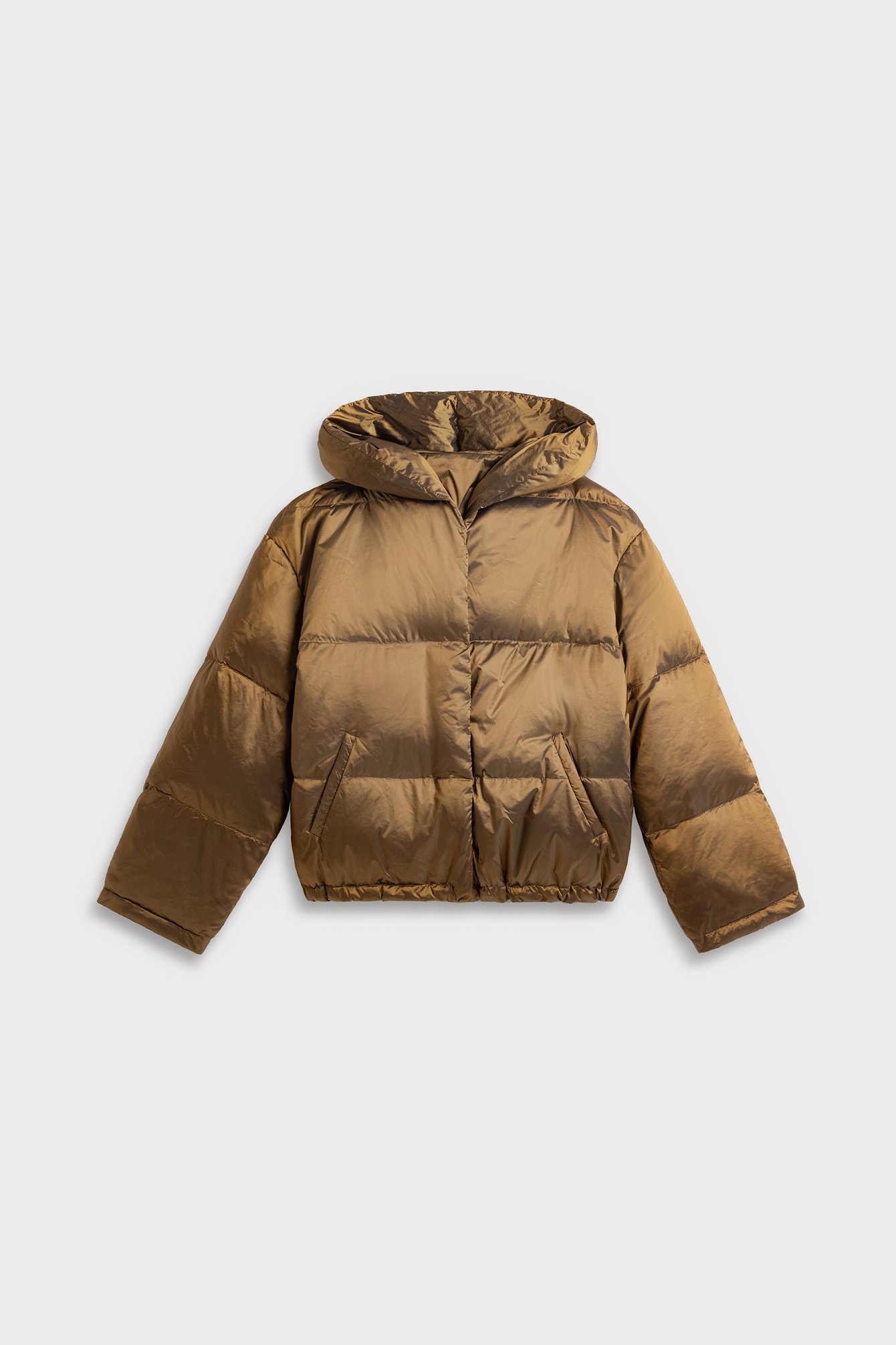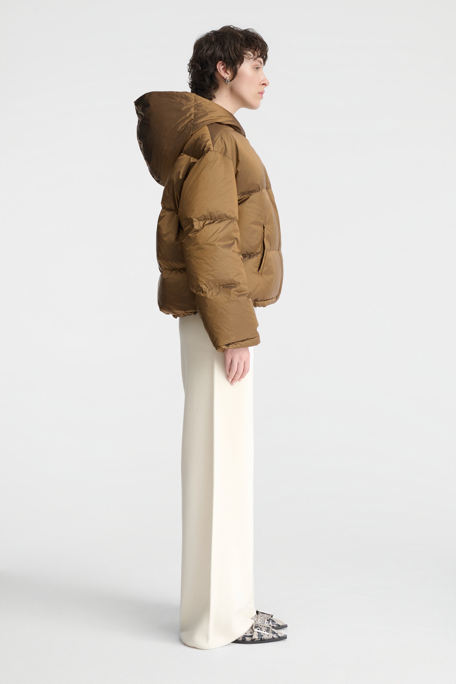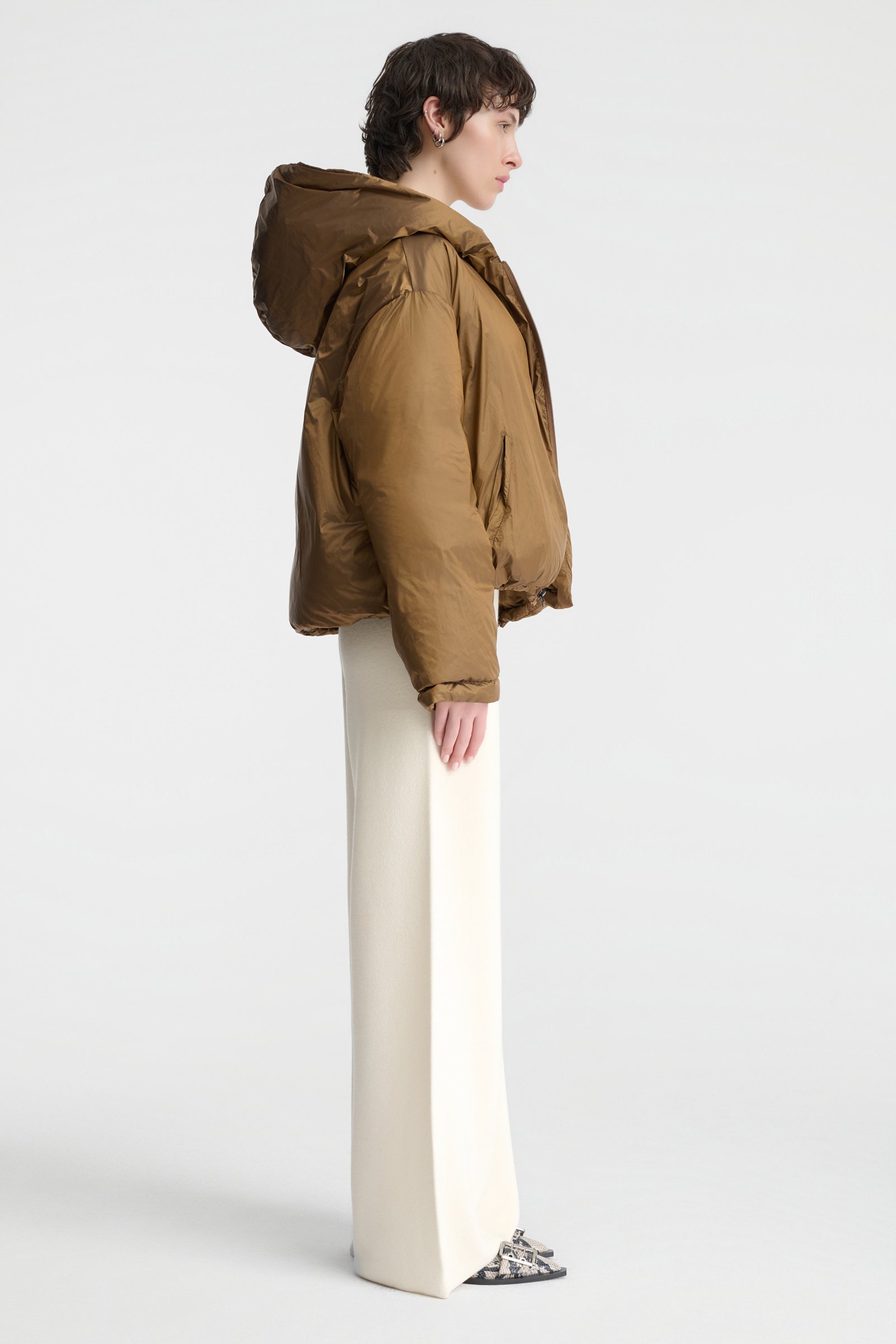 Lekka, a jednocześnie ciepła kurtka o krótkim kroju. Zwraca uwagę niezwykłym odcieniem złocistej oliwki – to piękna barwa, która nada charakter każdej stylizacji. Świetnie skomponuje się zarówno z czernią lub czekoladowym brązem, jak i z odcieniami beżu i écru. To dwustronny model z kapturem i puchowym wypełnieniem. Jedna ze stron jest gładka i minimalistyczna, druga posiada poziome pikowanie w szerokie pasy. Kurtka posiada dyskretne kieszenie, zapięcie na zamek, swobodne rękawy oraz obszerny kaptur. Krótki krój powoduje, że doskonale komponuje się z dołami o podniesionej talii. Będzie efektownym zwieńczeniem stylizacji – można nosić ją w okresie przejściowym oraz w cieplejsze zimowe dni.