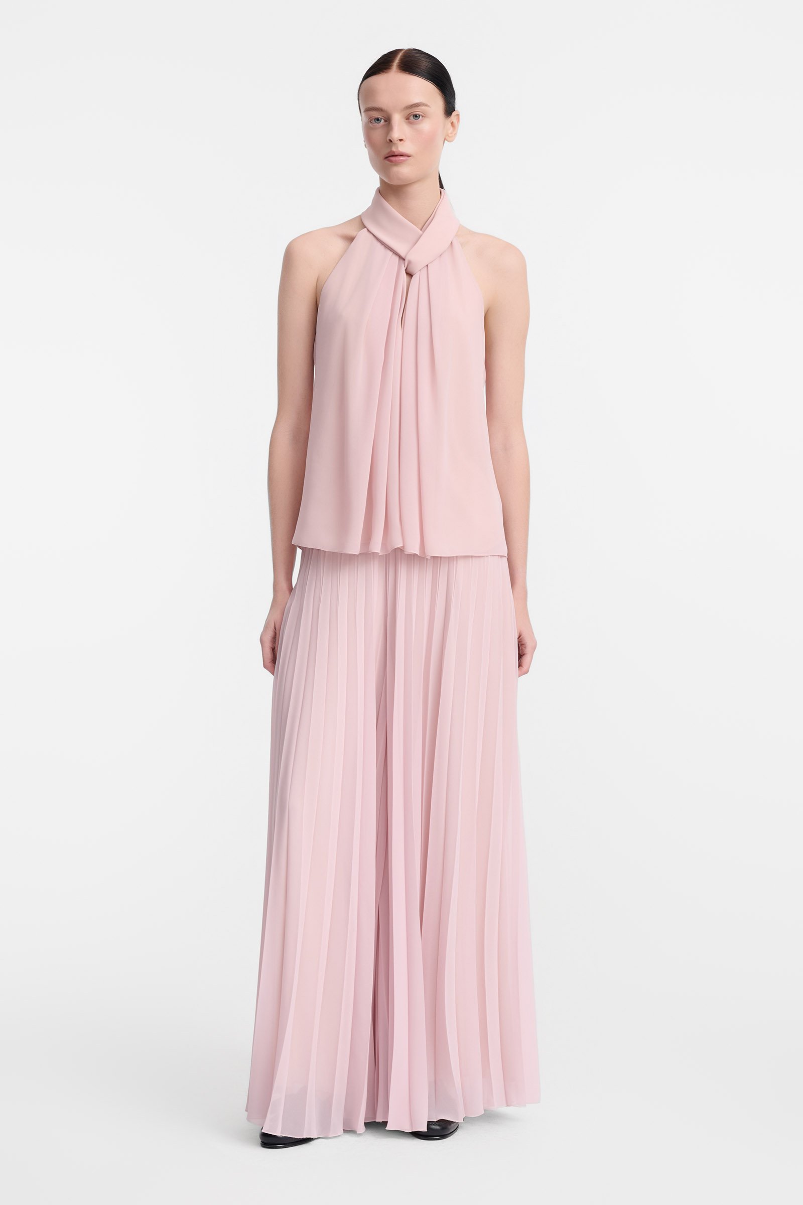 Zwiewne, szerokie spodnie wykonane z lekkiej, plisowanej tkaniny szyfonowej to doskonały wybór na wyjątkowe okazje. Model zachwyca subtelną formą i kobiecym charakterem, pięknie układając się w ruchu i optycznie wydłużając sylwetkę. Wysoki komfort noszenia zapewnia brak zapięcia oraz lekka, oddychająca podszewka z wiskozy. Szerokie, rozszerzane nogawki podkreślają elegancki styl, a dołączony pasek pozwala dopasować model do sylwetki.
