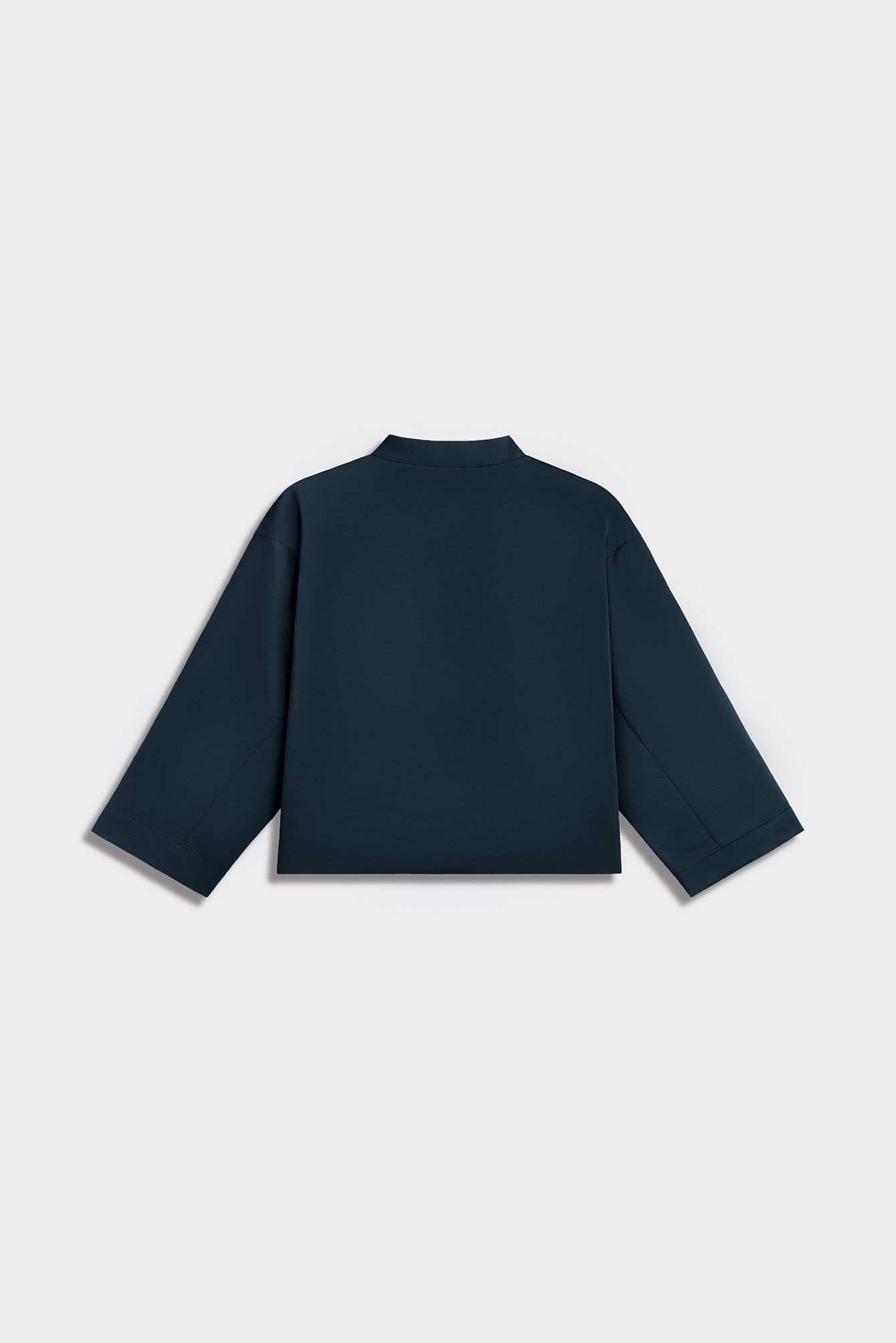 Krótki, elegancki żakiet wykonany z wysokogatunkowej tafty o gładkiej fakturze zachwyca subtelnym połyskiem, który odbija światło, nadając sylwetce lekkości i szyku. Głęboki, szlachetny granat idealnie współgra z minimalistyczną formą, podkreślając ponadczasowy charakter modelu. Stójkowy dekolt oraz zwężane rękawy 3/4 delikatnie modelują linię ramion i talii, a nowoczesne zapięcie na zamek i ukryte w szwach kieszenie dodają funkcjonalności bez zakłócania eleganckiego wyrazu. Brak podszewki sprawia, że żakiet jest wyjątkowo lekki i komfortowy. W zestawie z sukienką (1157/B5) tworzy stylową, harmonijną całość, idealną na wyjątkowe okazje.