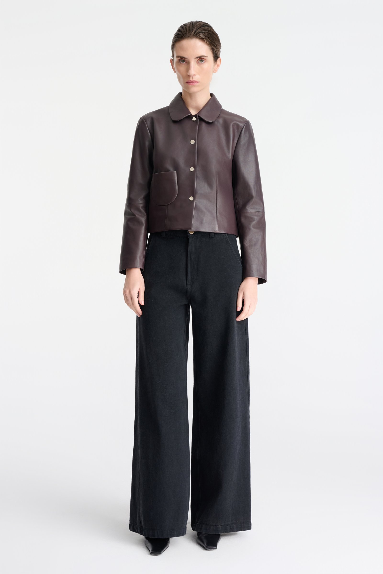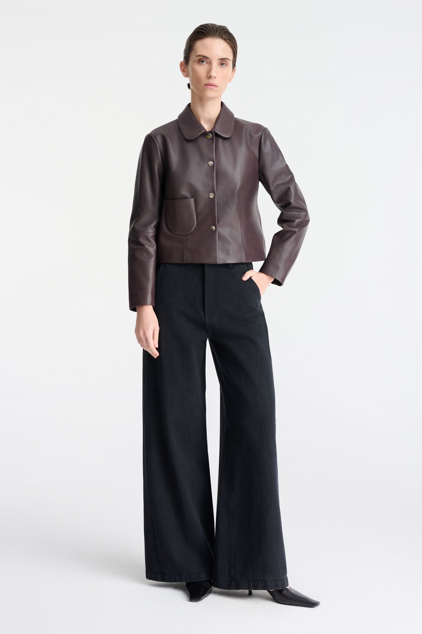 Kurtka z naturalnej skóry jagnięcej w przyjemnym i głębokim odcieniu wiśniowym. Zwraca uwagę zaokrąglonym kołnierzykiem oraz zapięciem na metalowe napy. To model o krótkim kroju i długich rękawach z dekoracyjnymi cięciami w okolicach łokci. Kurtka posiada nakładaną kieszonkę o zaokrąglonym kształcie, co zmiękcza jej linie oraz doskonale komponuje się z kołnierzykiem. Produkt wyposażono w gładką podszewkę dla wysokiego komfortu noszenia. Kurtka z naturalnej skóry to wszechstronne okrycie o przejściowym charakterze. Można nosić ją z ciemnymi, ale też z beżowymi lub kremowymi dołami. Będzie świetnym uzupełnieniem spodni o swobodnych nogawkach, ale pasuje nawet do spódnic i sukienek z dzianiny.
