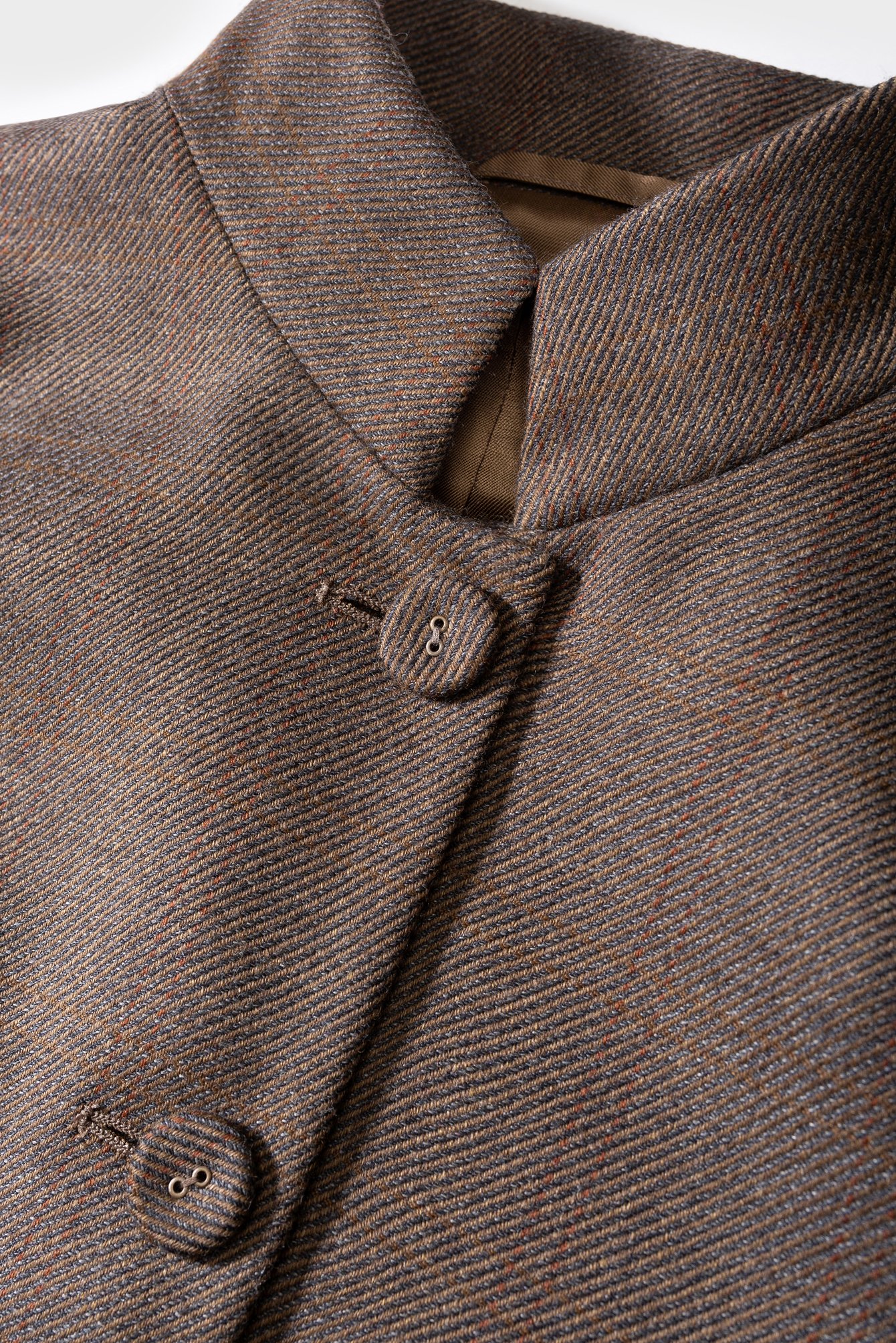 Kurtka typu bomber o krótkim kroju z jednorzędowym zapięciem na guziki. Wykonana z wełnianej tkaniny z delikatnym deseniem kratki i wyposażona w gładką podszewkę z acetatu. Utrzymana w neutralnej i bardzo wszechstronnej kolorystyce khaki. Zwraca uwagę efektowną stójką oraz marszczonymi mankietami rękawów. To model wyposażony w kieszenie ukryte w szwach. Wełniana kurtka typu bomber idealnie sprawdzi się w okresie przejściowym jako okrycie wierzchnie. W chłodniejszych miesiącach można traktować ją, jak żakiet i zakładać pod grubszą kurtkę lub płaszcz. Wraz ze spodniami z tego samego materiału (1021/B5) stworzy spójny komplet. Można nosić ją jednak w wielu innych zestawieniach – na przykład z czarnymi, brązowymi lub ciemnozielonymi dołami.
