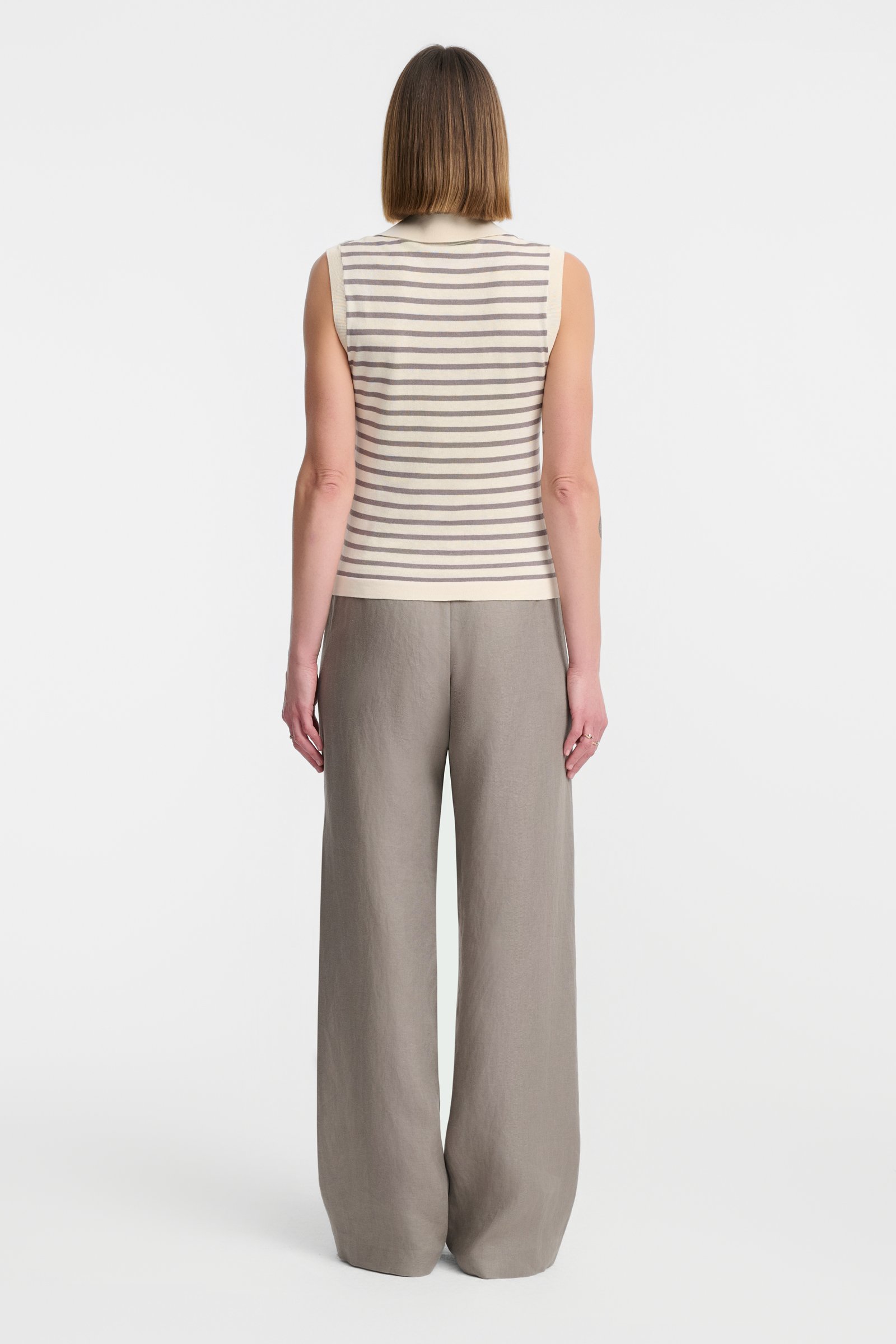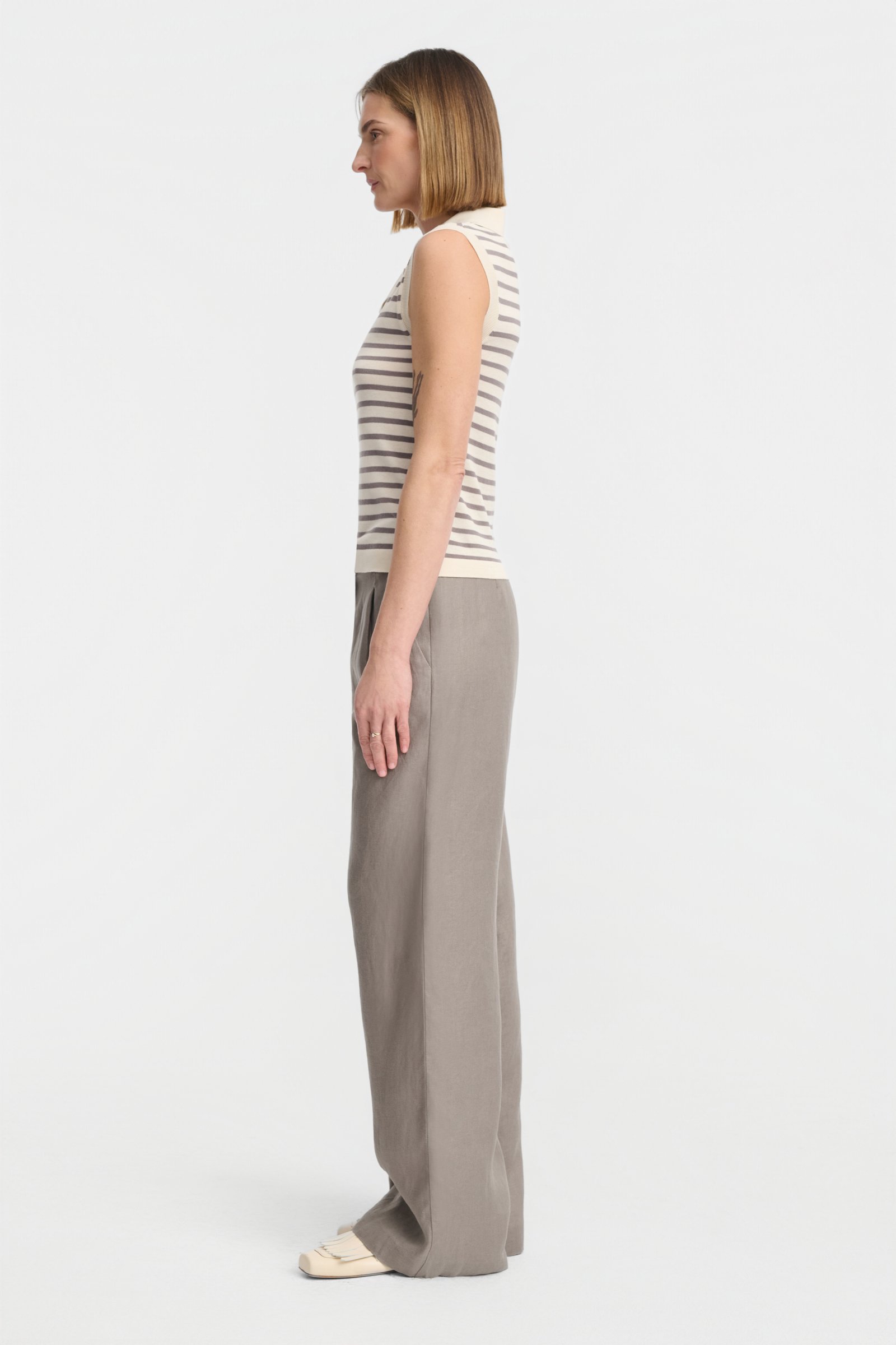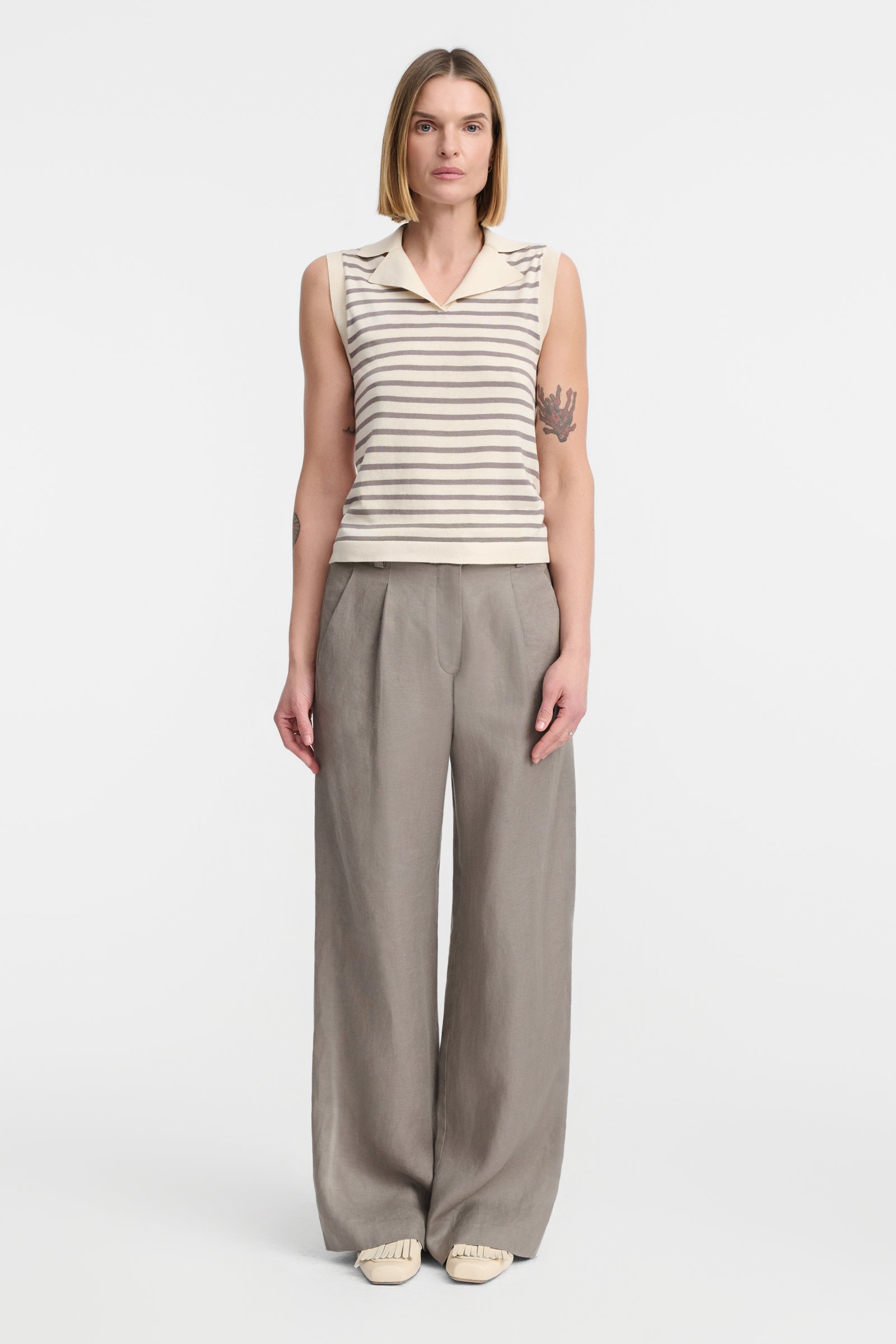Lniane spodnie w kolorze fango. Model o prostym, wydłużonym kroju z szeroką nogawką, która swobodnie układa się w ruchu i optycznie wysmukla sylwetkę. Z przodu subtelna zakładka podkreśla klasyczny, dopracowany charakter fasonu. Spodnie zapinane są na zamek, posiadają praktyczne, skośne kieszenie oraz starannie wykończony pas. Naturalna, oddychająca tkanina lniana zapewnia komfort noszenia, czyniąc model idealnym wyborem zarówno do stylizacji biznesowych, jak i eleganckich zestawów codziennych. Brązowy, uniwersalny odcień doskonale komponuje się z marynarką z tej samej linii, tworząc ponadczasowy, spójny komplet.