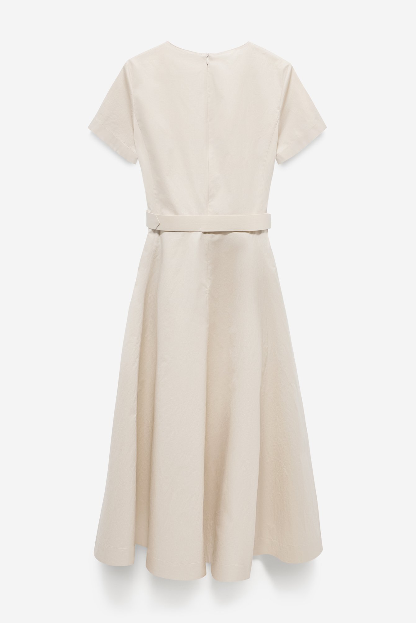 Sukienka o długości maxi, model o rozszerzanym fasonie, skonstruowany z klinów, zapewniających swobodę ruchów. Talia podkreślona paskiem z tkaniny zasadniczej. Sukienka posiada okrągły dekolt oraz krótkie rękawy o prostym kroju, wykończone mankietem. Z tyłu zastosowano zapięcie na zamek. Po bokach znajdują się kieszenie ukryte w szwach. Tkanina gładka, w kolorze ecru.