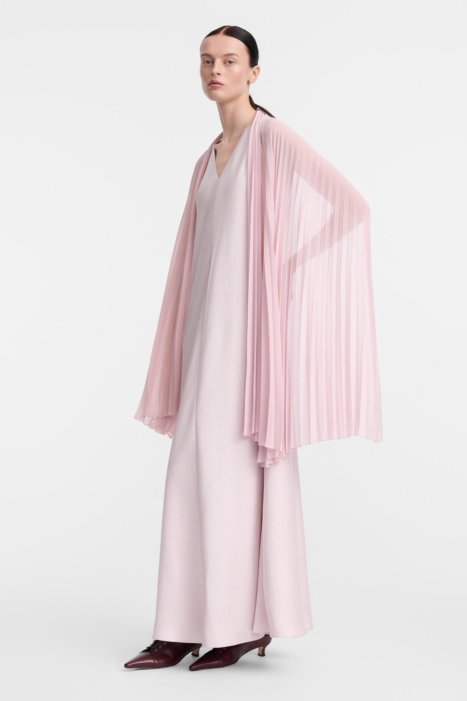 Elegancka, długa sukienka o lekko rozszerzanym kroju wykonana z gładkiej satynowej tkaniny. Model bez rękawów z klasycznym, okrągłym dekoltem z przodu oraz dekoltem w kształcie litery V na plecach. Ozdobna aplikacja kwiatowa z długim trokiem nadaje stylizacji subtelny, kobiecy charakter. Sukienka krojona ze skosu pięknie układa się na sylwetce i sprawdzi się podczas wyjątkowych okazji.