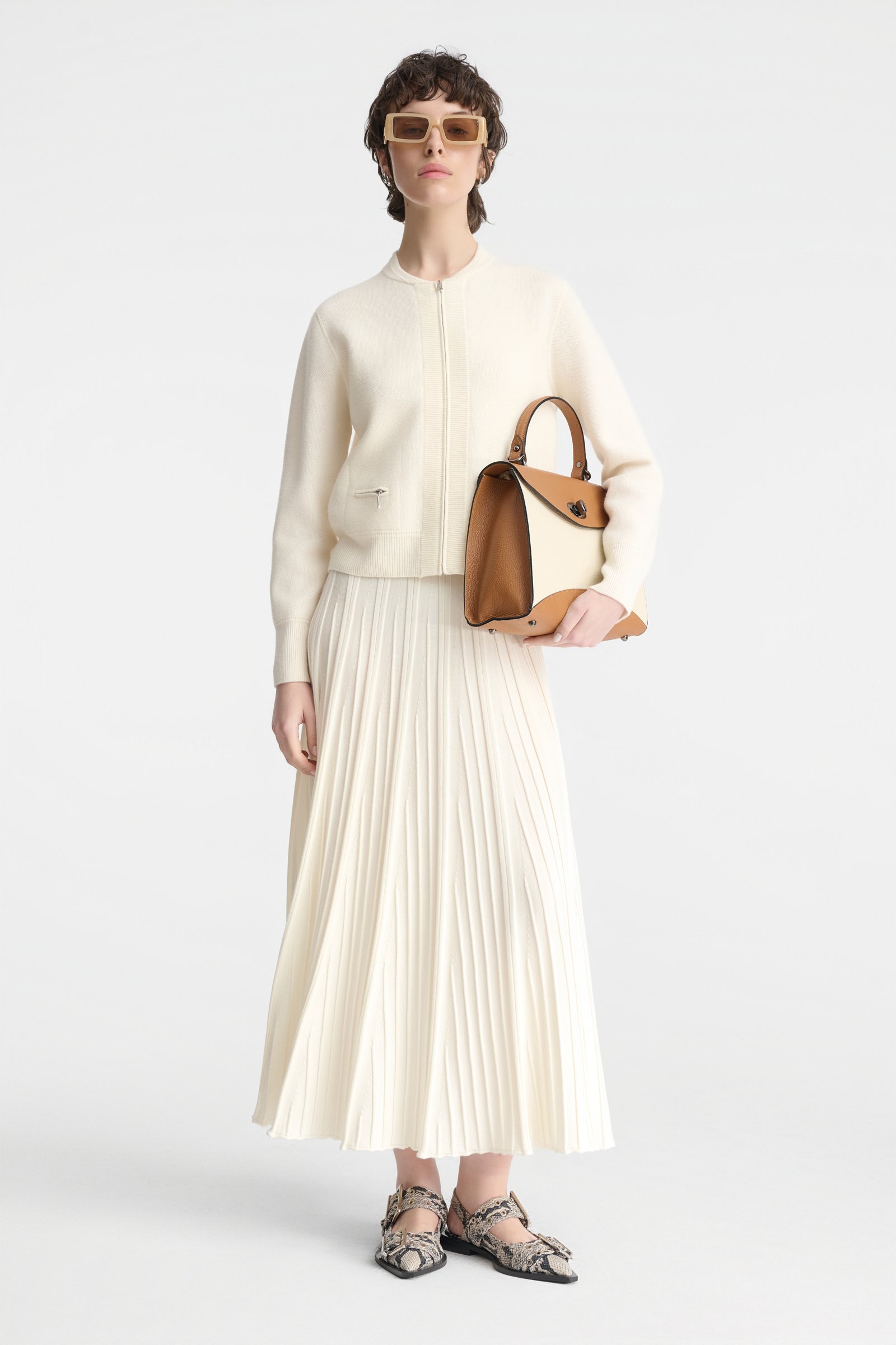 Długa spódnica o swobodnym, rozszerzanym kroju. Wykonana ze szlachetnej dzianiny z naturalnej wełny merino i wyposażona w gładką podszewkę, dzięki której dobrze się układa i nie prześwituje. Utrzymana w delikatnym odcieniu écru – idealna do miękkich stylizacji casualowych z gładkimi bluzkami i sweterkami. To model o długości maxi, który wyróżnia się materiałem z efektem plisowania. Spódnica posiada elastyczną talię bez zapięcia, dzięki czemu świetnie dopasowuje się do sylwetki. Ma casualowy charakter, ale w zależności od dodatków można wykorzystać ją w codziennych lub eleganckich stylizacjach. To świetny wybór nie tylko na sezon jesienno-zimowy, ale również na chłodniejsze dni lata.