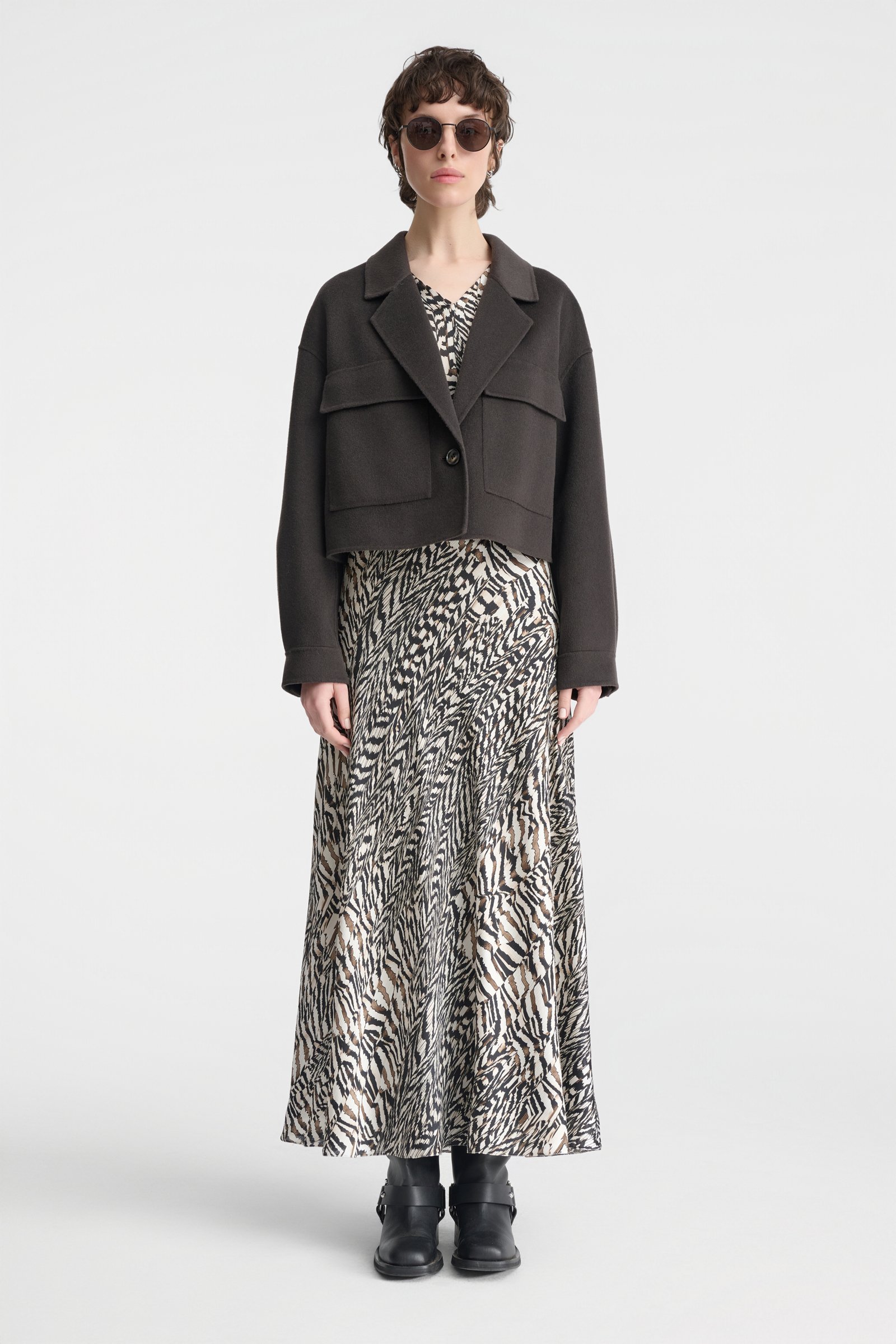Efektowna spódnica o długości maxi, która zwraca uwagę motywem zebry o beżowo-brązowej tonacji. To model o rozszerzanym kroju, który został uszyty ze skosu – dzięki temu pięknie opływa sylwetkę i świetnie układa się w ruchu. Spódnica posiada gładką podszewkę oraz elastyczną talię z gumką. Jest komfortowa w noszeniu i odpowiednia do wielu stylizacji o casualowym charakterze. Ciekawie wygląda w zestawieniu total look z bluzką z identycznym motywem (1017/B5), ale można nosić ją również w stylizacjach z gładkimi bluzkami i swetrami w beżowej, kremowej lub brązowej tonacji.