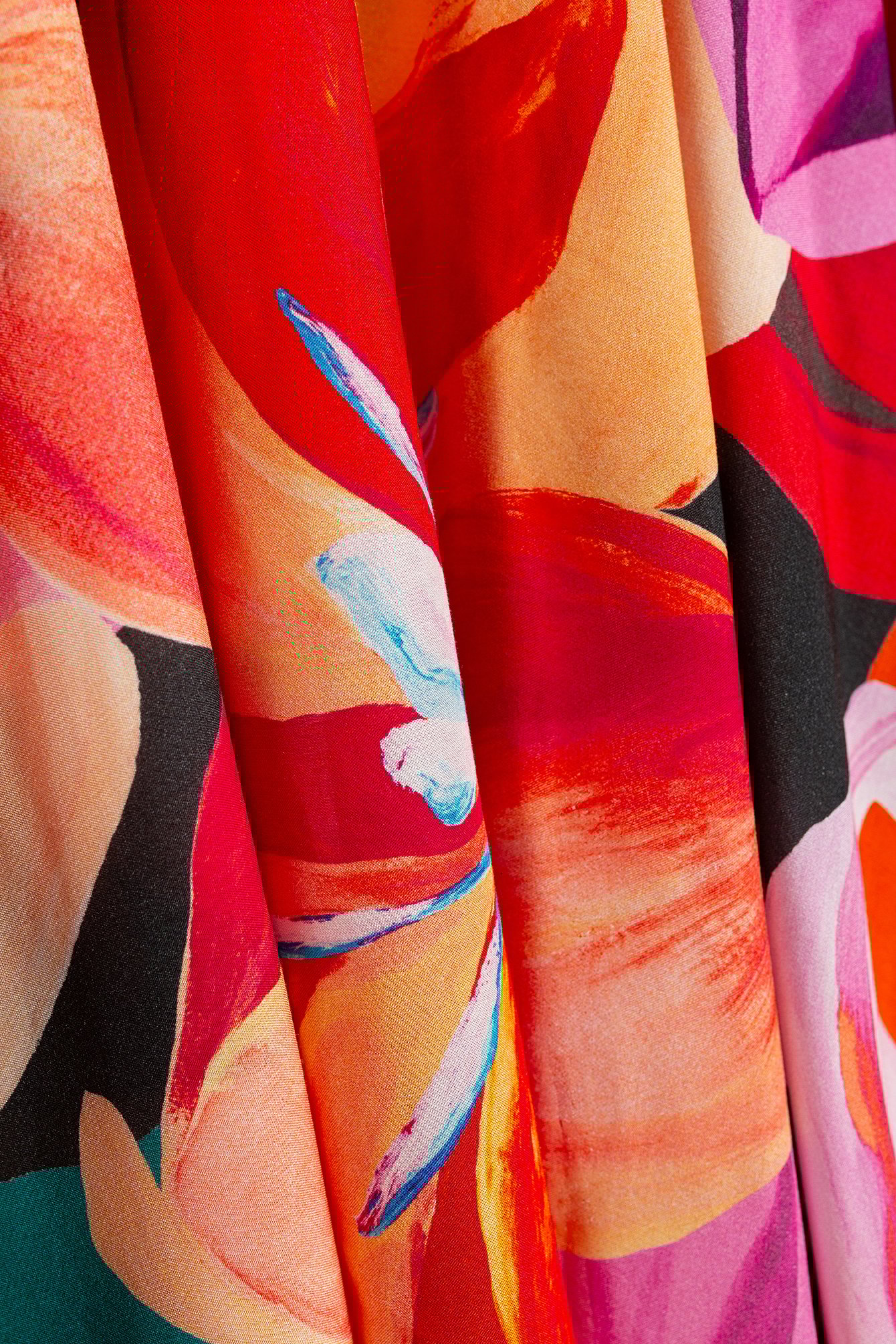 Lekka i przewiewna spódnica z wiskozy o wyjątkowo wyrazistej kolorystyce, w której neutralna czerń i ciemna zieleń zostały skontrastowane z odcieniami pomarańczy i różu. To model o elastycznej talii – bardzo wygodny w noszeniu i zapewniający perfekcyjne dopasowanie do sylwetki. Rozszerzany krój spódnicy idealnie współgra z jej długością oraz kolorystyką, nadając stylizacji niezobowiązujący charakter. Wiskozowa spódnica z kwiecistym motywem idealnie wpisuje się w typowo letnie i wakacyjne zestawienia. To element garderoby, który przywodzi na myśl urlop w tropikach, a jednak można sięgnąć po niego każdego dnia. Do wielobarwnej spódnicy świetnie pasują neutralne góry – na przykład proste t-shirty i bluzki na ramiączkach.