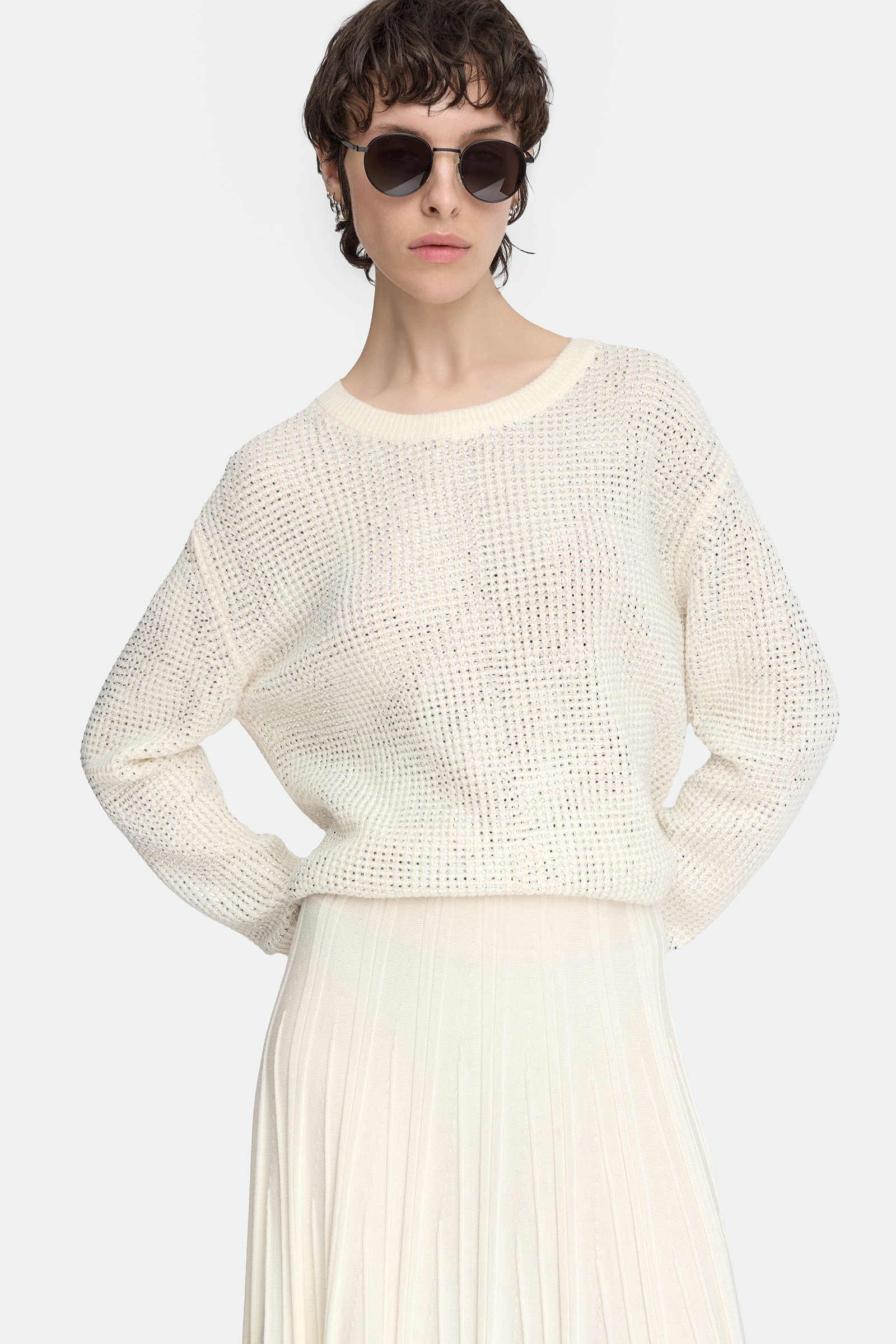 Swobodny i komfortowy, a jednocześnie zwracający na siebie uwagę – sweter z naturalnej wełny merino o strukturalnym splocie. Jego cała powierzchnia została ozdobiona biżuteryjnymi detalami – ich regularne rozmieszczenie wprowadza do stylizacji ciekawą harmonię oraz intensywną grę światła. Sweter utrzymany jest w delikatnej i neutralnej tonacji écru, ma swobodny fason, okrągły dekolt oraz rękawy o obniżonej linii ramion i zwężanym kroju. Jego krawędzie wykończone są ściągaczami i to właśnie one są powierzchniami wolnymi od biżuteryjnych zdobień. To sweter, który idealnie wpisuje się w wizytowe stylizacje na chłodniejsze dni. Można zestawić go ze spódnicą lub spodniami w tej samej tonacji, ale będzie pasował również do czerni, grafitu czy też głębokiego granatu.
