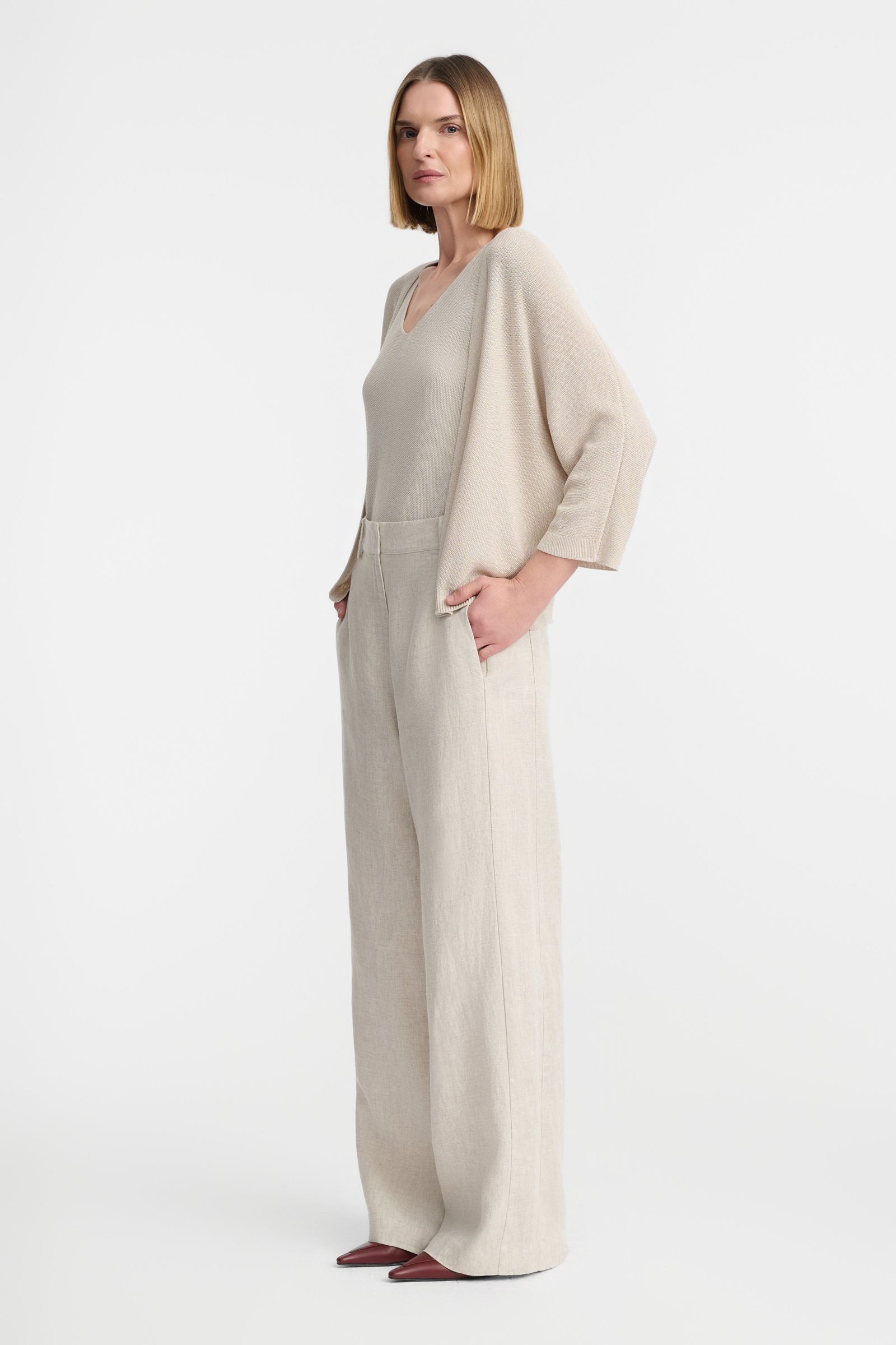 Lekki sweter o regularnym fasonie, wykonany z gładkiej dzianiny wiskozowej z dodatkiem lureksu, który wprowadza delikatny efekt połysku. Otwarta forma bez zapięcia oraz rękawy o kroju kimono i długości 3/4 zapewniają swobodę noszenia i miękkie układanie się na sylwetce. Beżowy kolor i prosta konstrukcja sprawiają, że model dobrze sprawdza się jako uzupełnienie codziennych stylizacji, noszony na top lub sukienkę.